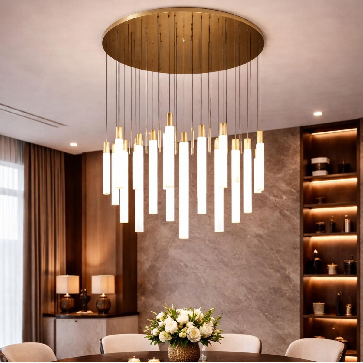 Als modernes Statement unter luxuriösen Kronleuchtern entworfen, hängt dieser Multi LED weiße Röhre Antik Goldfarbener Pendelleuchter mehrere mattierte weiße Zylinder in einem klaren, linearen Cluster auf. Jeder mattierte Glaszylinder streut das LED-Licht sanft und erzeugt eine gleichmäßige, angenehme Lichtverteilung, die Wände, Möbel und Essbereiche vorteilhaft in Szene setzt. Die schlanken vertikalen Formen bewahren die luftige Gesamtwirkung, während die wiederholten Zylinder Rhythmus und visuelles Interesse aus jedem Blickwinkel schaffen.