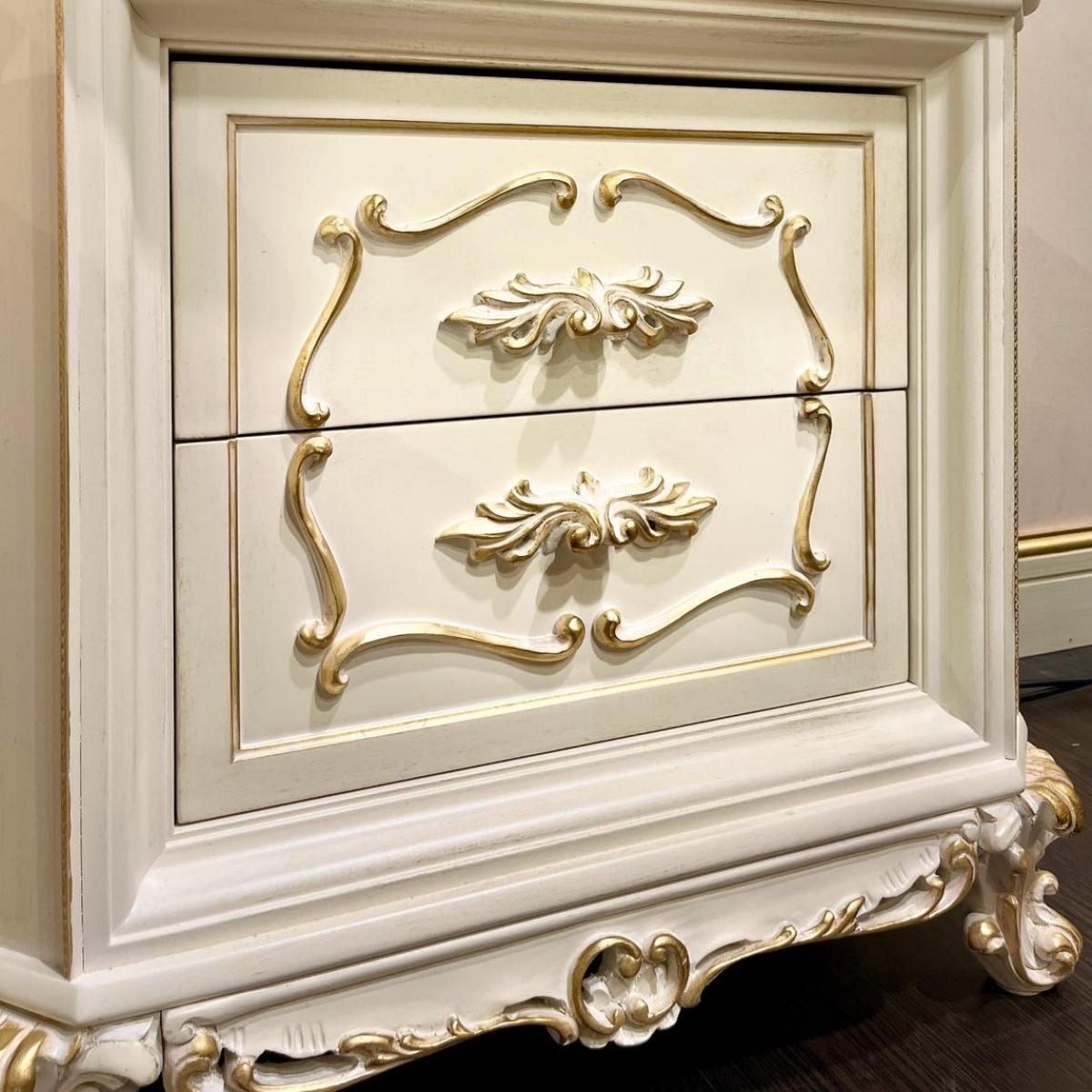 Verschönern Sie Ihr Schlafzimmer mit dem Regalia Ivory Gold Nachttisch, ein wahres Statement des europäischen Luxus. Mit seiner raffinierten elfenbeinfarbenen Lackierung, den goldenen Details und der exquisiten Keramikplatte Emperador Gold passt er perfekt zu eleganten Interieurs. Ideal neben einem Kingsize- oder Queensize-Bett, verleiht es Ihrem persönlichen Rückzugsort sowohl Stil als auch Funktionalität.