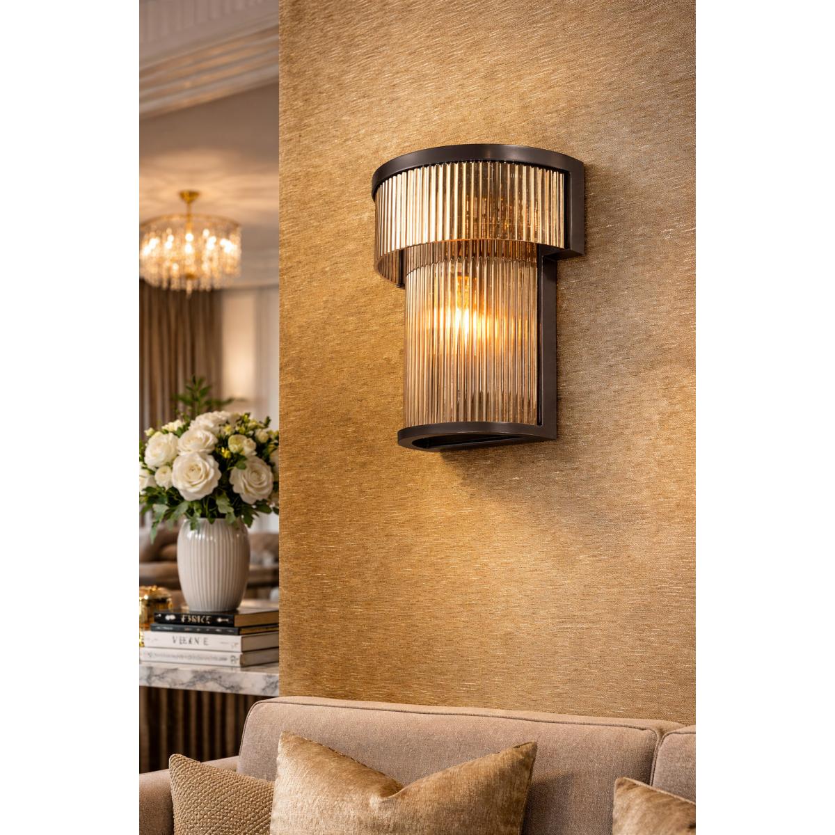 Mit seiner matten Oberfläche, dem warmen bronzefarbenen Akzent und dem leicht getönten Glas unterstützt diese Wandleuchte eine zeitgemäße Innenraumgestaltung mit künstlerischem Anspruch. Sie spiegelt himmlische Formen durch moderne Designsprache wider: Das geflötete Glas erinnert an ein Sternbild aus Lichtreflexen um eine zentrale Achse, während die symmetrischen Metallringe eine polierte, architektonische Balance bewahren. Wählen Sie diese Leuchte, um alltägliche Räume mit einem stilvollen Statement zu bereichern, das bronzenes Finish mit strukturierter, sanft strahlender Beleuchtung verbindet. Das Ergebnis ist ein edler Lichtmoment – klare Linien, warmes Leuchten und ein charakteristischer geriffelter Zylinder, der Persönlichkeit ohne Überladen vermittelt. Entdecken Sie unsere Luxus-Wandleuchten-Kollektion, um raffinierte Lichtobjekte zu finden, die Atmosphäre schaffen und architektonische Eleganz in Ihre Räume bringen.