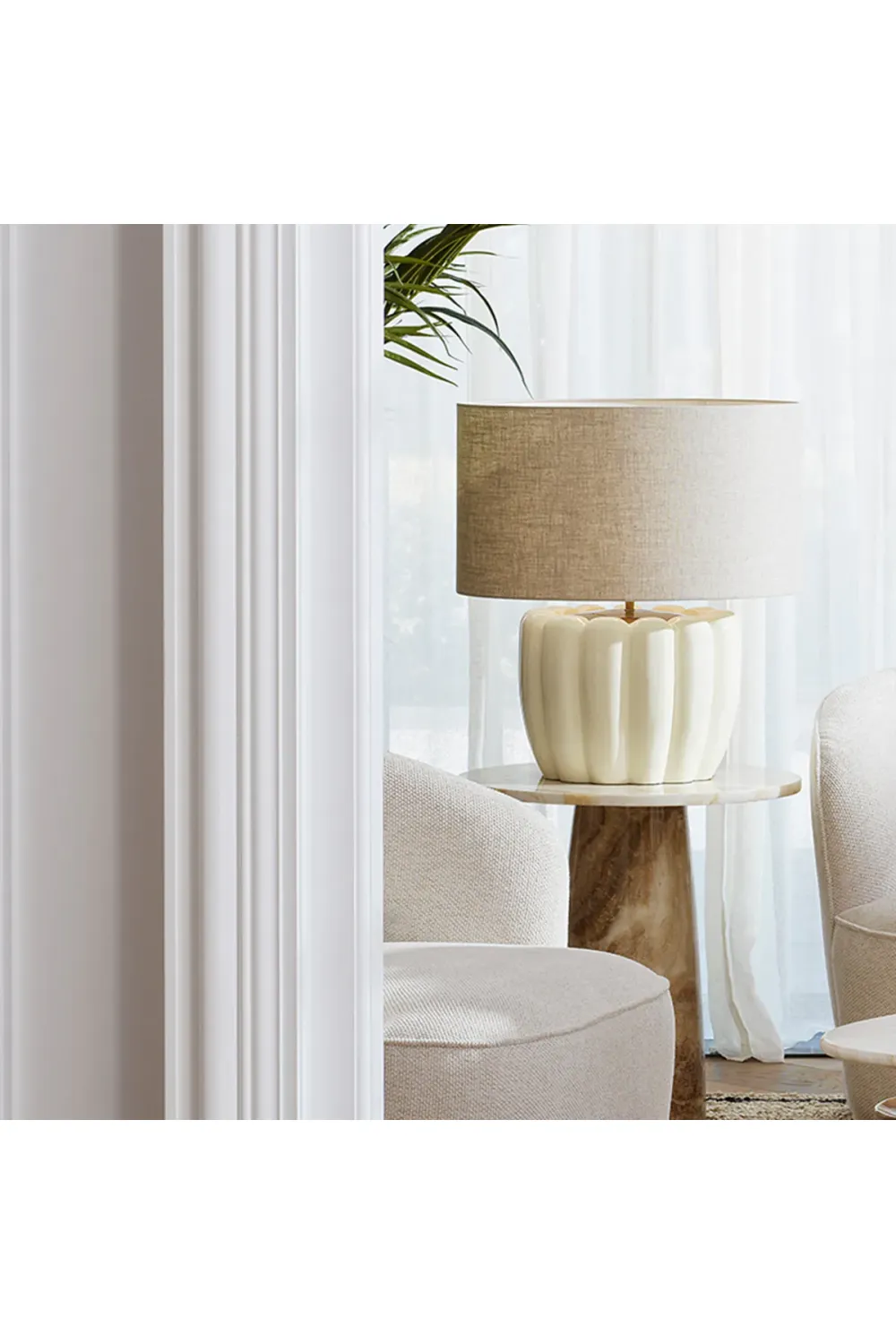 Durable wooden base with neutral linen shade