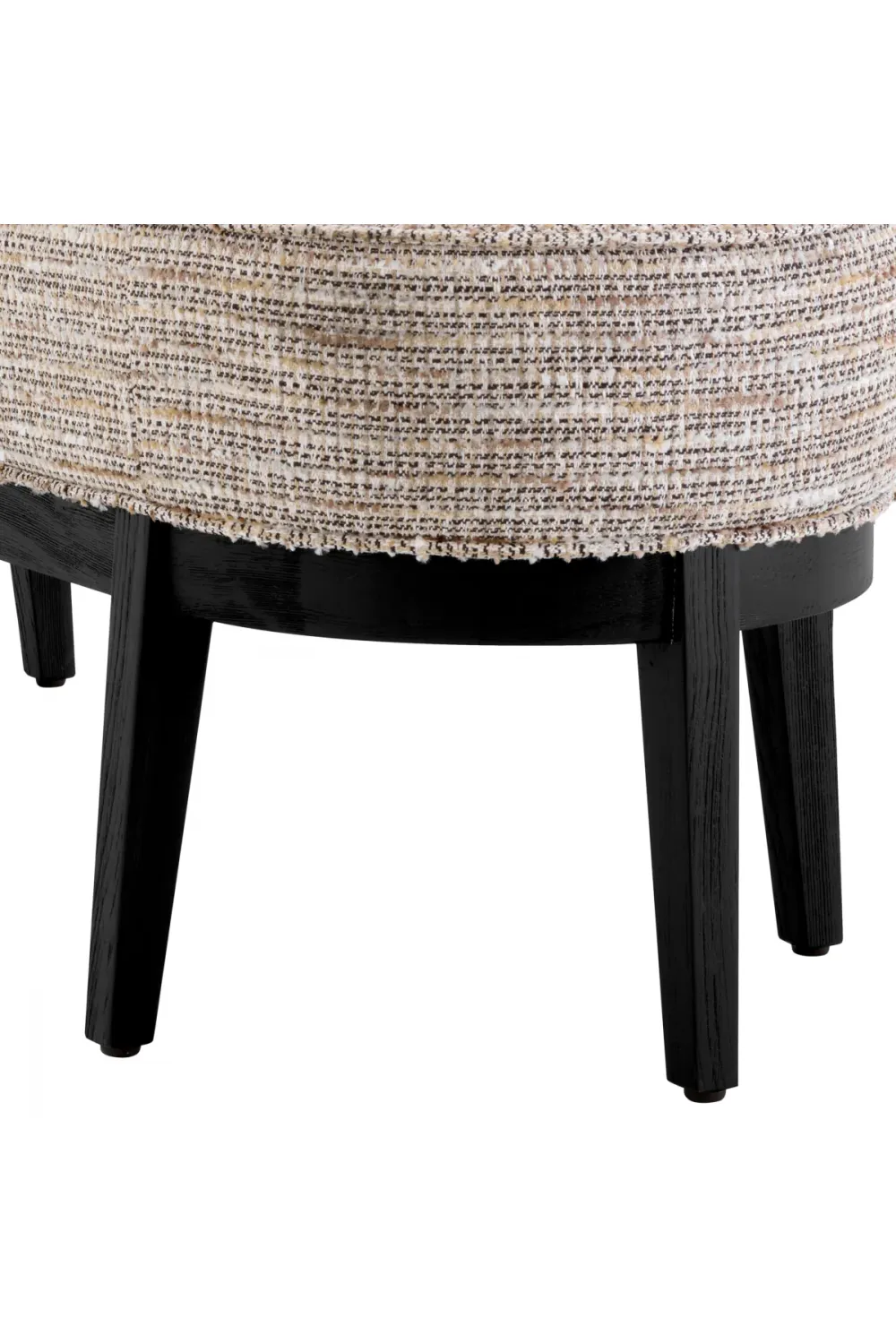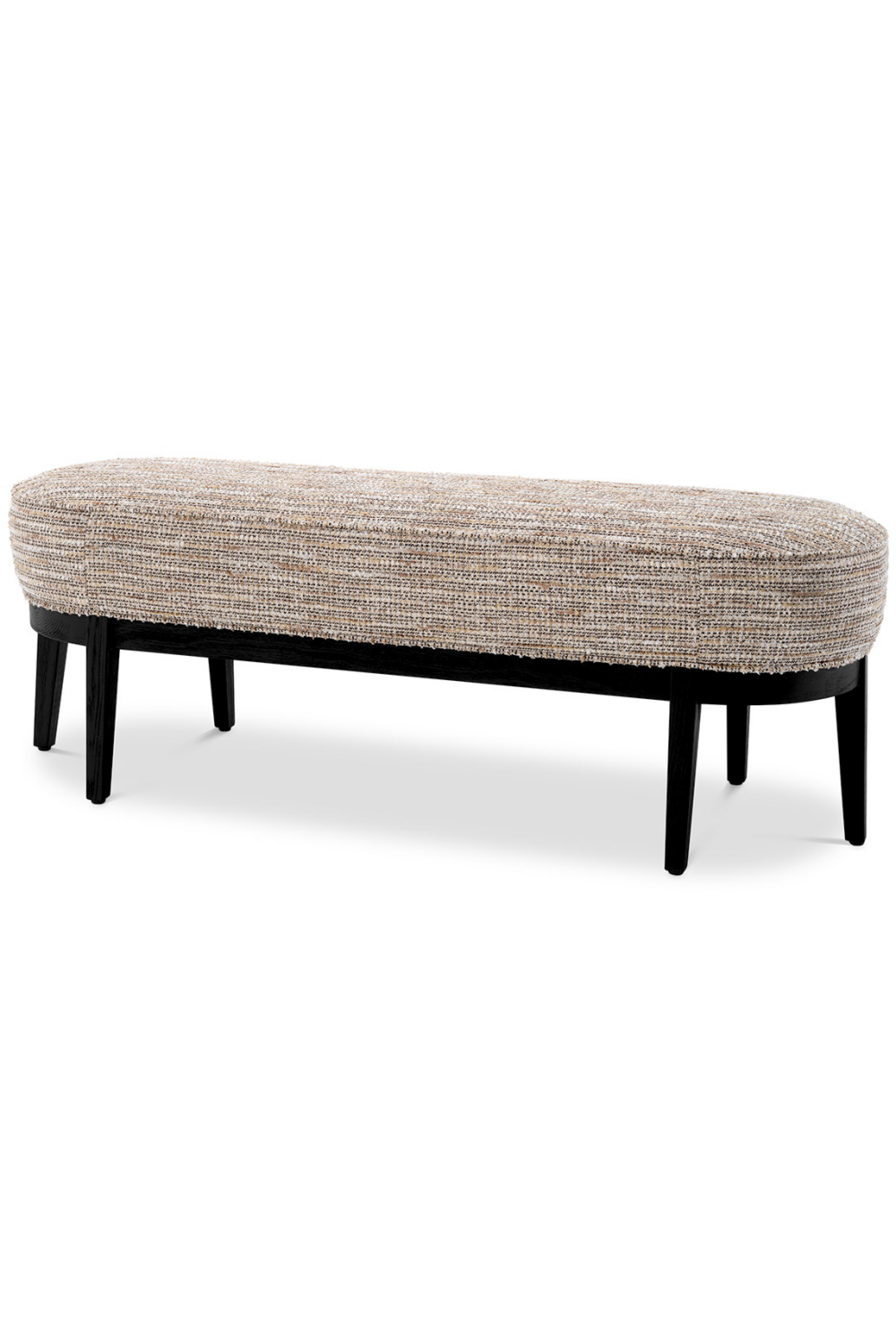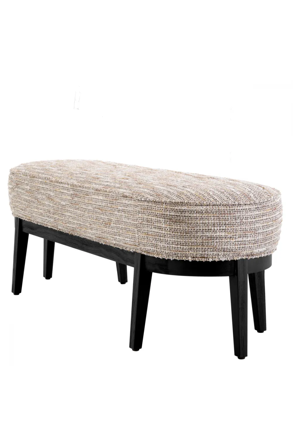 The seat, upholstered in premium Mademoiselle beige fabric, offers a soft and inviting texture, while the black finish frame introduces a striking visual contrast that enhances its contemporary appeal. Uniquely designed with three sculpted legs on each side, this bench showcases both creativity and craftsmanship, making it a genuine statement piece.