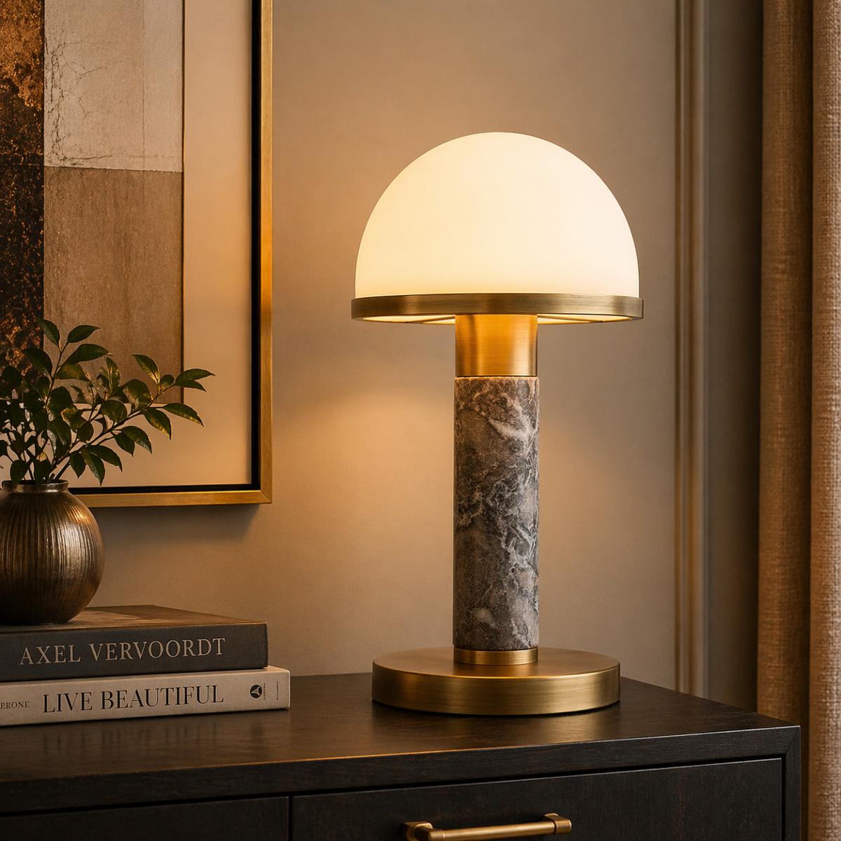 The dome-shaped lampshade is crafted from white glass table lamp material, designed to soften and diffuse light for a welcoming ambience. Instead of harsh glare, the milky, opal-like glow helps create a calm atmosphere for reading corners, evening relaxation, or ambient background lighting. The antique brass finish details add architectural definition, framing the column and highlighting the gentle curves of the dome for a balanced, elevated finish. With its elegant proportions and clean visual lines, this Grey marble table lamp brings a sense of crafted luxury without overpowering your décor.