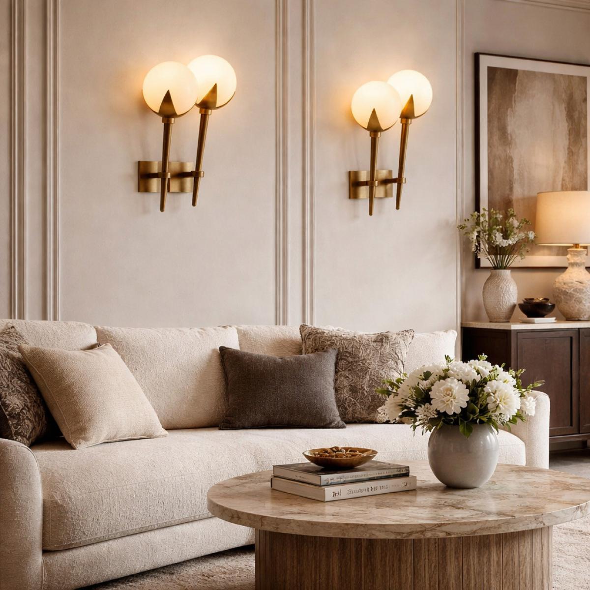 In style terms, this is where classic Art Deco fascination with celestial forms meets mid-century modern elegance. The brushed brass surface enhances the warm tone of the hardware, grounding the look with a luxurious metal presence. The twin-dome arrangement provides a balanced visual impact from nearly every angle, making it well-suited to hallways, living areas, and bedroom walls where you want refined character. If you’re seeking brushed brass wall lighting that delivers diffused ambience and a beautifully composed statement, this sconce is an ideal match. Discover refined lighting solutions in our luxury wall lamp collection, crafted to add warmth, elegance, and architectural sophistication to your interiors.