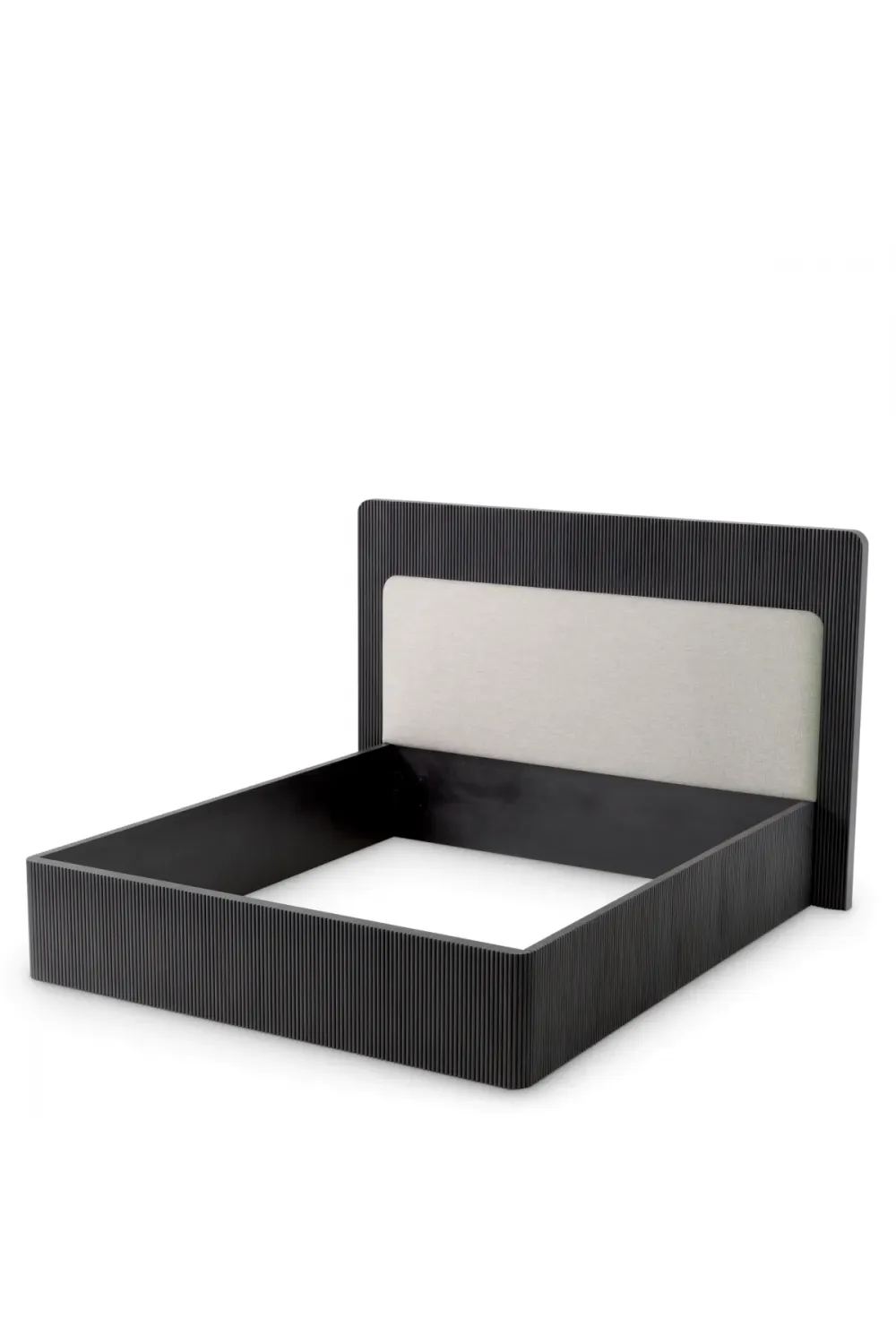 The Elegant Royale Bed Frame blends contemporary sophistication with timeless warmth. Crafted from charcoal grey ribbed mahogany wood and upholstered in natural Durini fabric, it exudes a refined balance of texture, tone, and comfort. Perfectly designed to pair with a box spring, it offers enduring support and understated luxury for modern interiors.