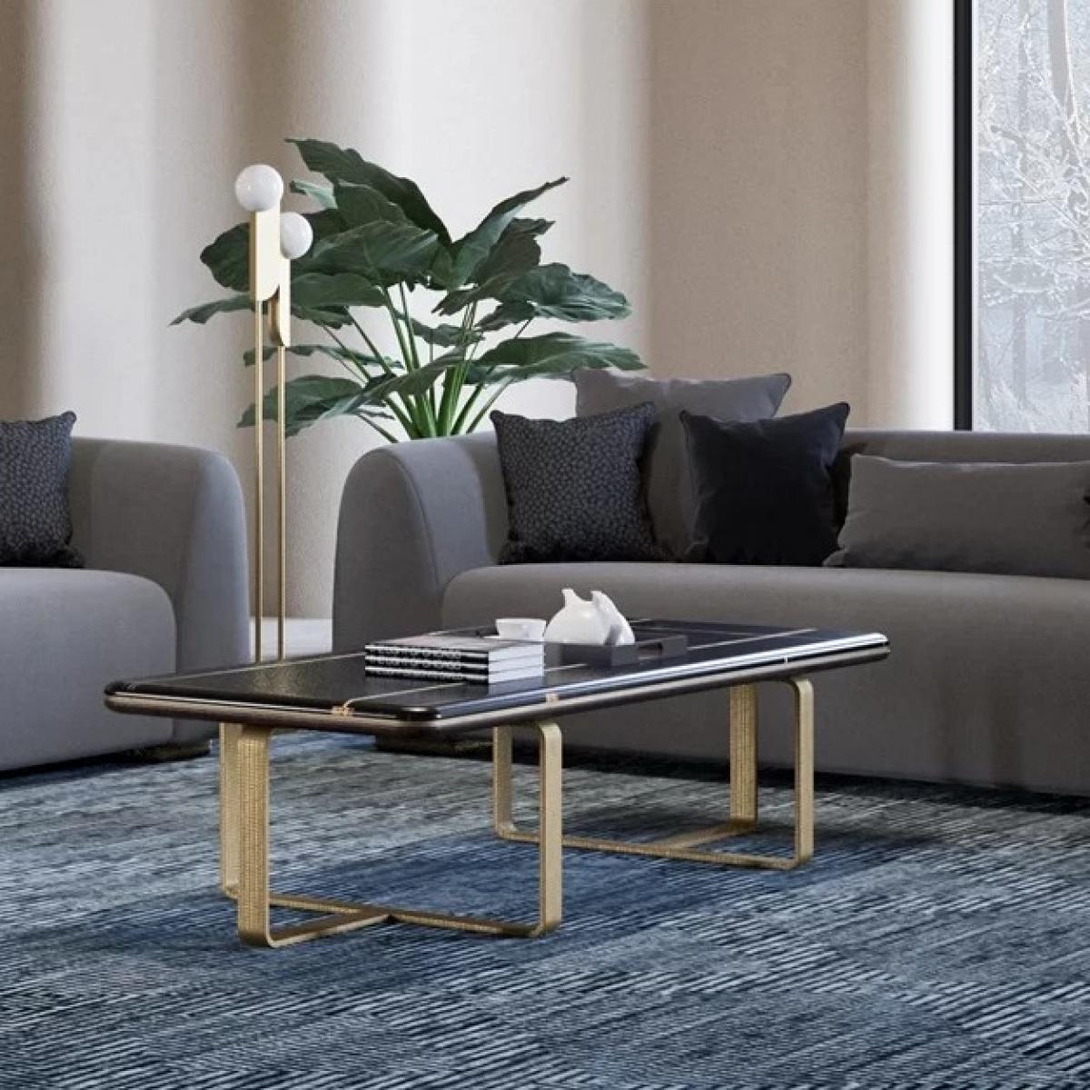 La Mesa de Centro Rectangular de Mármol Negro de Lujo con Patas en Acabado Latón para Salones Elegantes es una impresionante mesa de centro de lujo diseñada para realzar cualquier espacio con su sofisticada tapa de mármol negro. La forma rectangular ofrece una amplia superficie para colocar objetos decorativos, bebidas o libros, combinando funcionalidad con estilo de alta gama. Su superficie lisa de mármol exhibe vetas naturales, aportando carácter único y belleza atemporal a la decoración de su hogar.