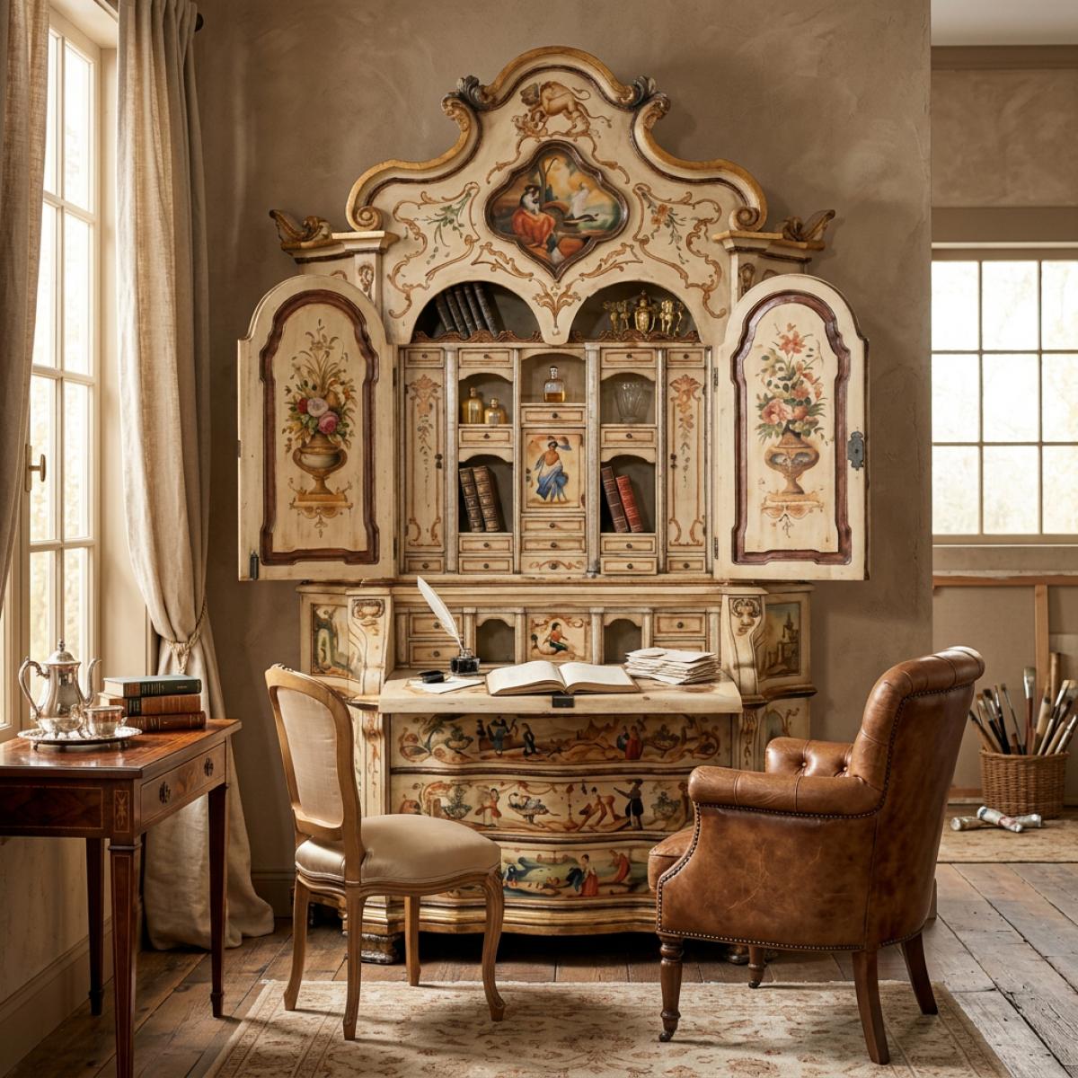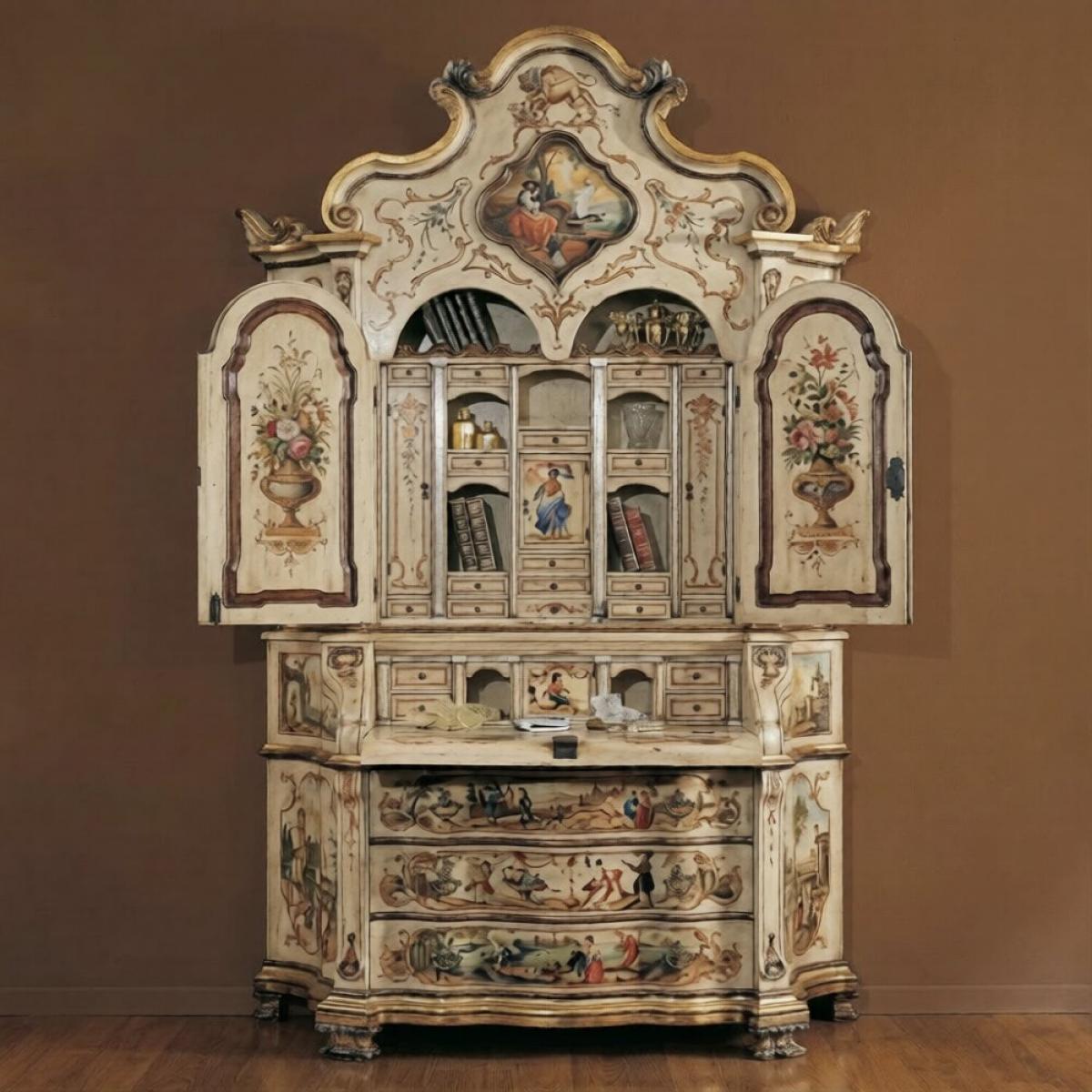 Gabinete Barroco Veneciano de Lujo Pintado a Mano con Escritorio Abatible y Almacenamiento de Múltiples Cajones es un refinado gabinete de lujo diseñado para realzar interiores europeos sofisticados. Con una corona arqueada ornamentada, paneles decorativos pintados a mano y una elegante silueta curva, este gabinete de almacenamiento barroco refleja la tradicional artesanía veneciana. El exterior bellamente detallado exhibe motivos florales, ilustraciones escénicas y bordes decorativos, mientras que el gabinete superior se abre para revelar compartimentos internos intrincados. El escritorio abatible proporciona un espacio de trabajo funcional, mientras que los cajones inferiores ofrecen almacenamiento práctico. Este gabinete de madera combina elegancia decorativa con una artesanía excepcional, siendo ideal para salas de estar, estudios o interiores refinados.