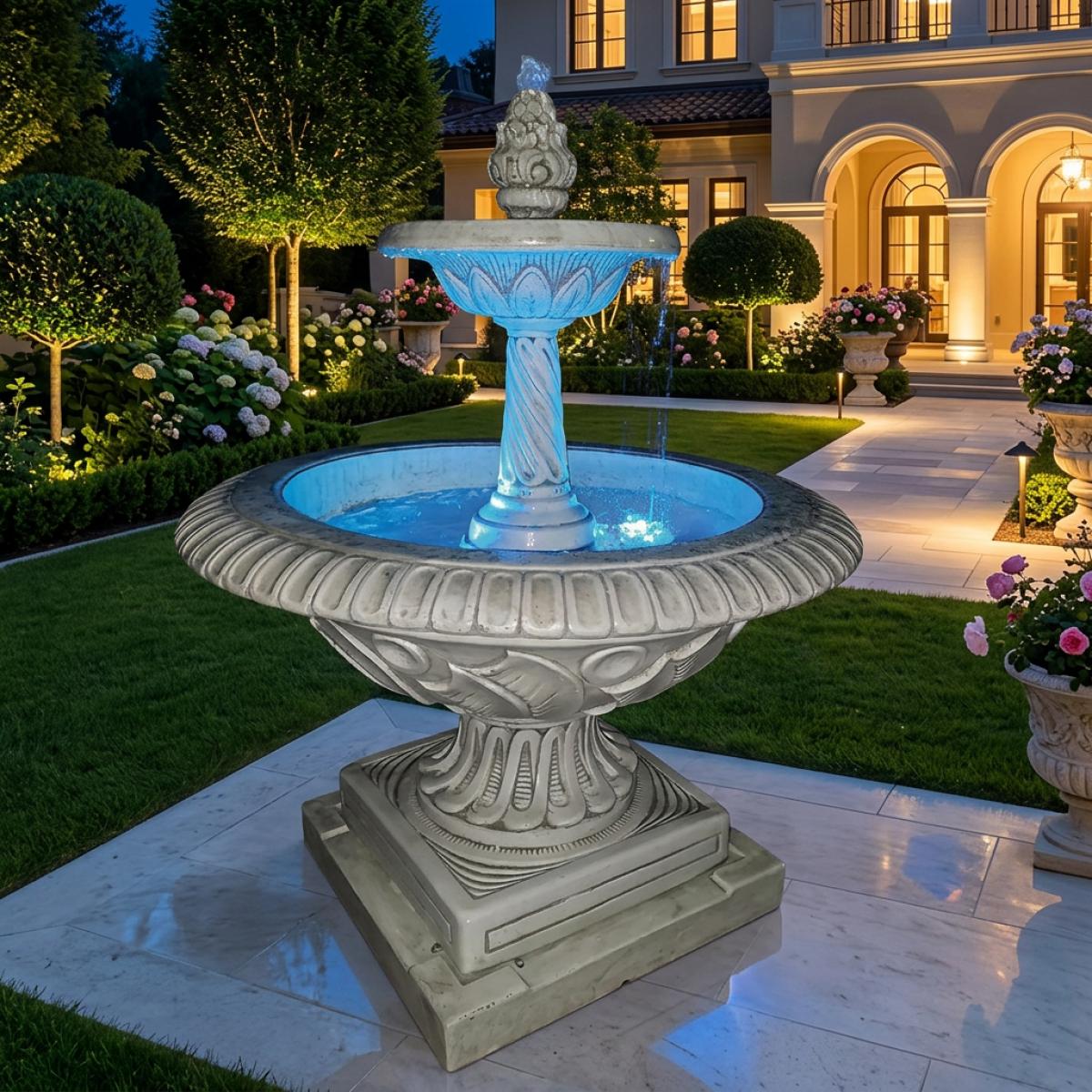 - Fuente barroca iluminada con diseño escalonado y cascada