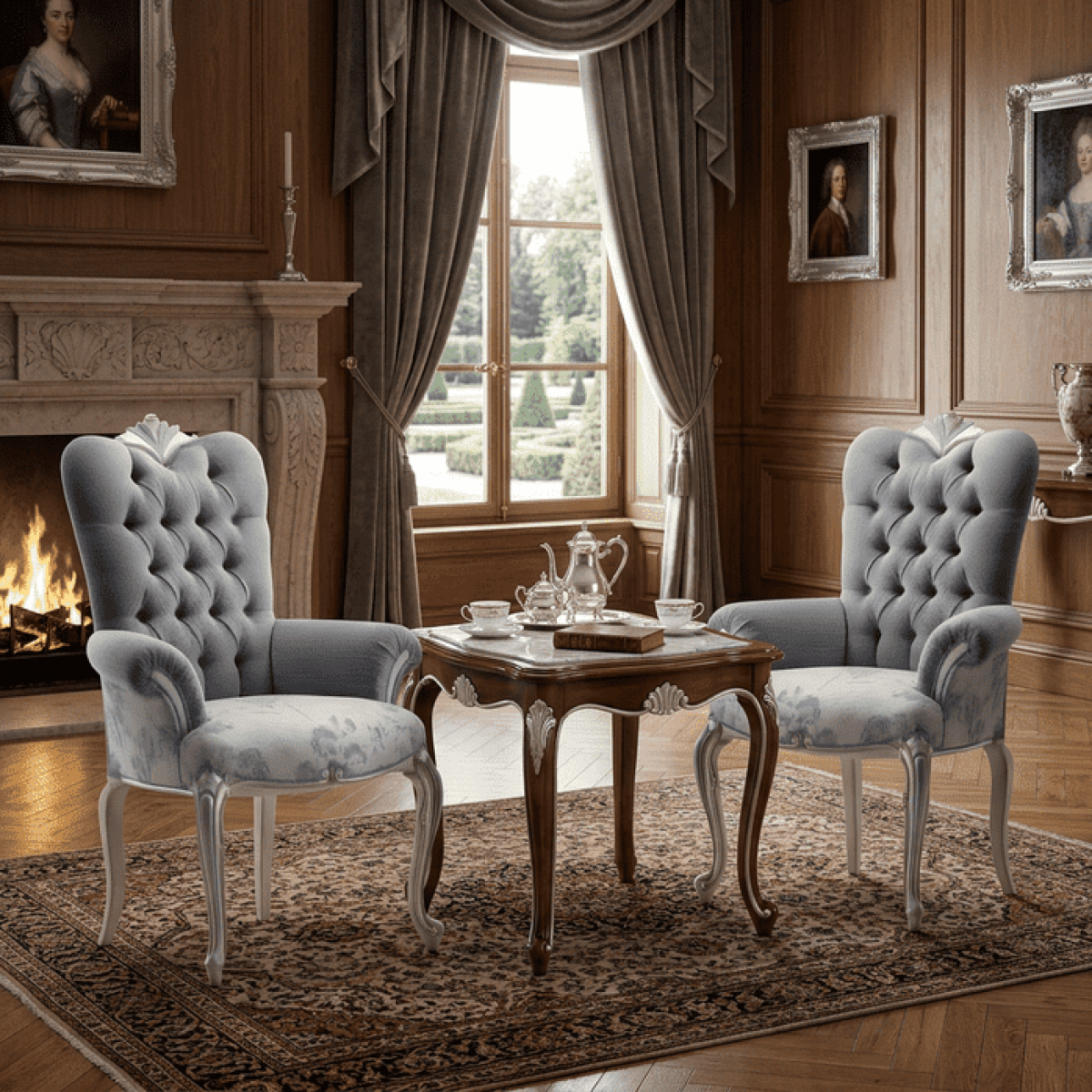 Fauteuil de Salle à Manger de Luxe Baroque à Dossier Couronne Capitonné avec Boutons, Tissu Gris et Structure Métallique Argentée incarne un savoir-faire européen raffiné et une élégance royale. Ce fauteuil de salle à manger rembourré de luxe présente un dossier haut capitonné avec boutons, rehaussé d’un ornement en forme de couronne décorative, créant une présence imposante. Le tissu gris doux apporte une sophistication visuelle, tandis que la structure métallique argentée sculptée et les pieds cabriole offrent un style baroque intemporel. Conçu pour allier confort et impact visuel, ce fauteuil de designer pour salle à manger sublime les salles à manger formelles et les intérieurs d’hôtellerie de luxe.