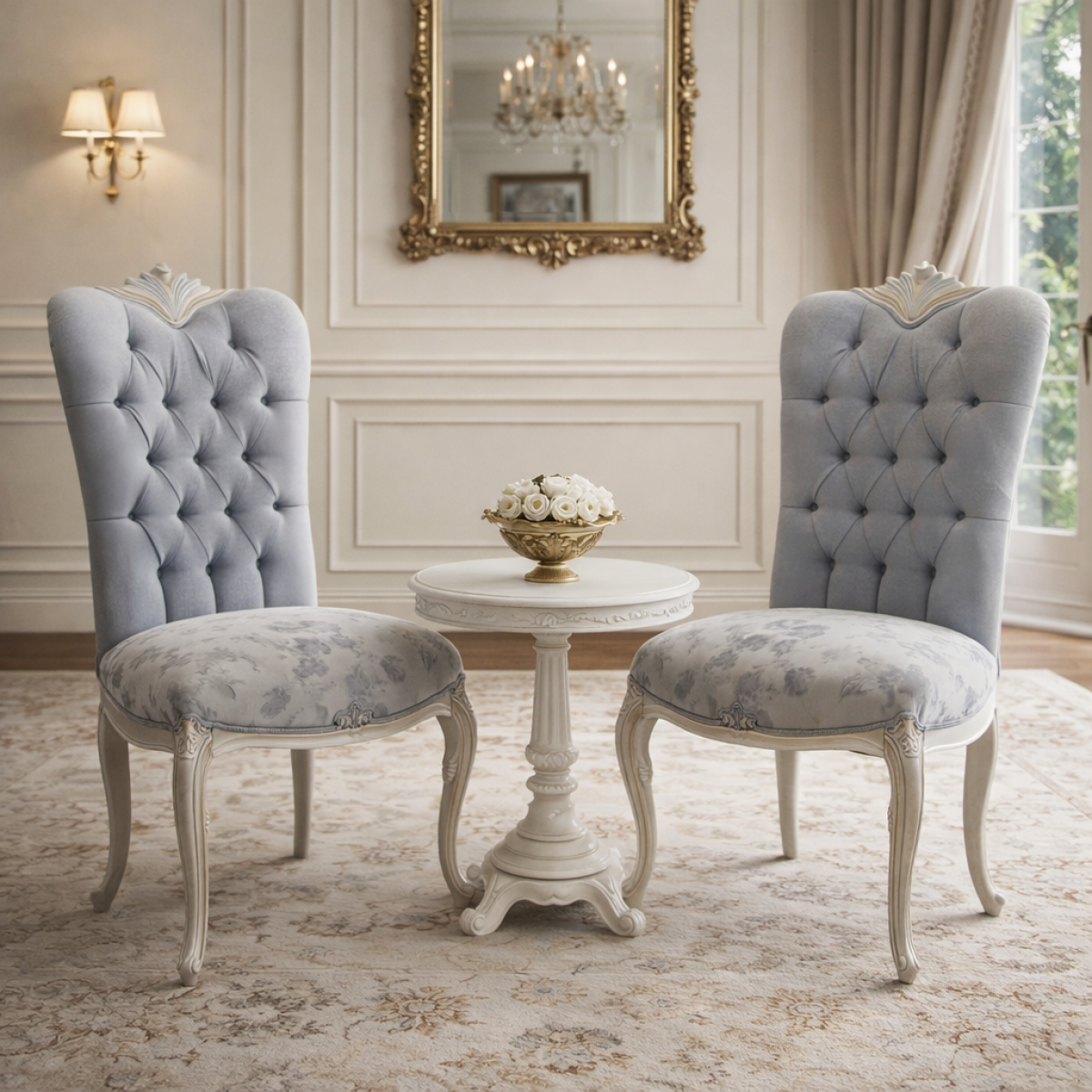 Chaise de Salle à Manger de Luxe Baroque à Dossier Couronné Capitonné avec Tissu Gris et Structure Métallique Argentée met en valeur un savoir-faire européen raffiné et une élégance intemporelle. Cette chaise de salle à manger rembourrée de luxe présente un dossier haut capitonné avec un sommet décoratif en forme de couronne, créant une silhouette royale. Le tissu gris doux complète parfaitement la structure métallique argentée sculptée, tandis que les pieds cabriole renforcent son apparence gracieuse. Conçue pour un impact visuel et un confort optimal, cette chaise de designer sublime les espaces de repas formels et les intérieurs de luxe.