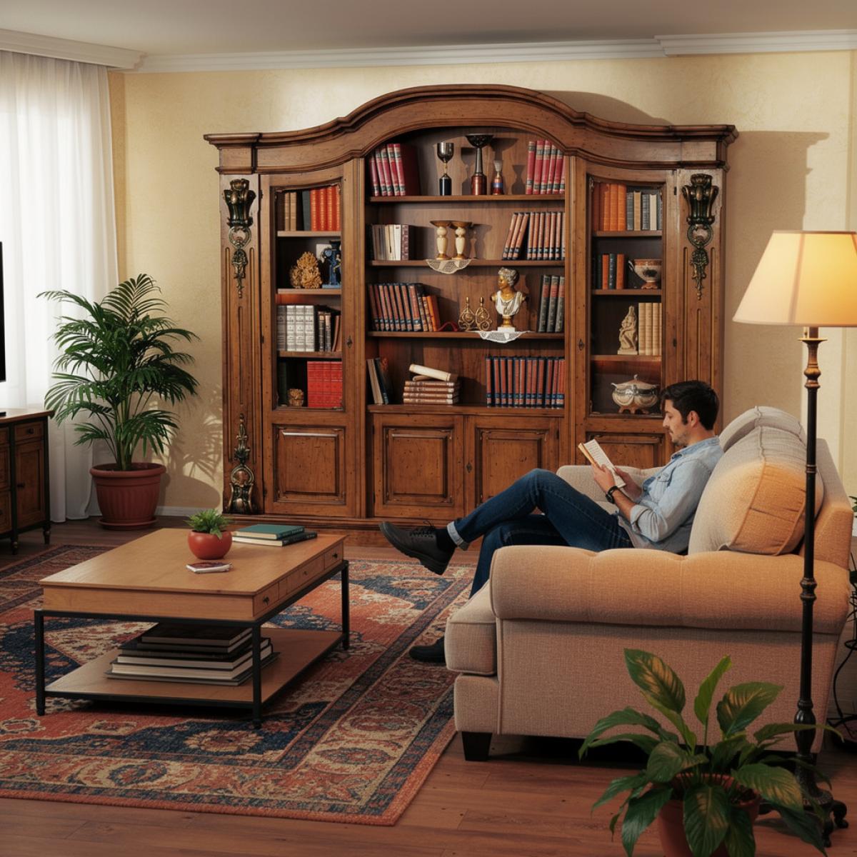 Conçue comme une armoire étagère en bois pour salon, la base de rangement inférieure fermée complète la structure avec une sensation plus épurée et discrète. Sous la baie d'exposition arquée, des portes à panneaux offrent un rangement protégé pour les objets que vous préférez garder à l'abri — tels que jeux de société, linges supplémentaires, accessoires saisonniers ou désordre personnel. Cette approche stratifiée de l'organisation vous aide à maintenir une atmosphère accueillante sans sacrifier la fonctionnalité. Du moulurage sculpté qui encadre l'architecture centrale aux détails raffinés en verre sur les sections latérales, cette armoire transforme le rangement en décoration, offrant à votre salon une pièce maîtresse soignée qui élève le quotidien. Ceux qui sont attirés par le même vocabulaire classique en noyer dans un format légèrement plus contenu peuvent souhaiter explorer la Armoire Étagère en Bois de Luxe Baroque avec Baie Centrale Ouverte — une pièce compagnon d'égale distinction artisanale qui offre une solution d'exposition complémentaire pour des intérieurs de proportions un peu plus intimes.