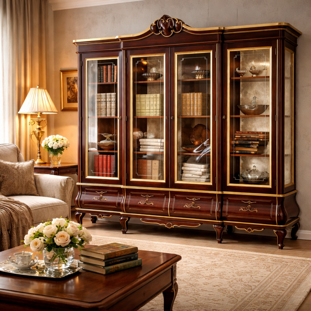 Cette vitrine design à portes multiples offre un rangement exceptionnel tout en conservant un design gracieux et équilibré. Notre collection exclusive de étagères/vitrines de luxe présente des meubles intemporels conçus pour des intérieurs raffinés. Pour une disposition cohérente et élégante, associez cette vitrine avec la Vitrine Baroque Ivoire à Portes Multiples en Verre, créant un cadre luxueux harmonieux dans votre espace.