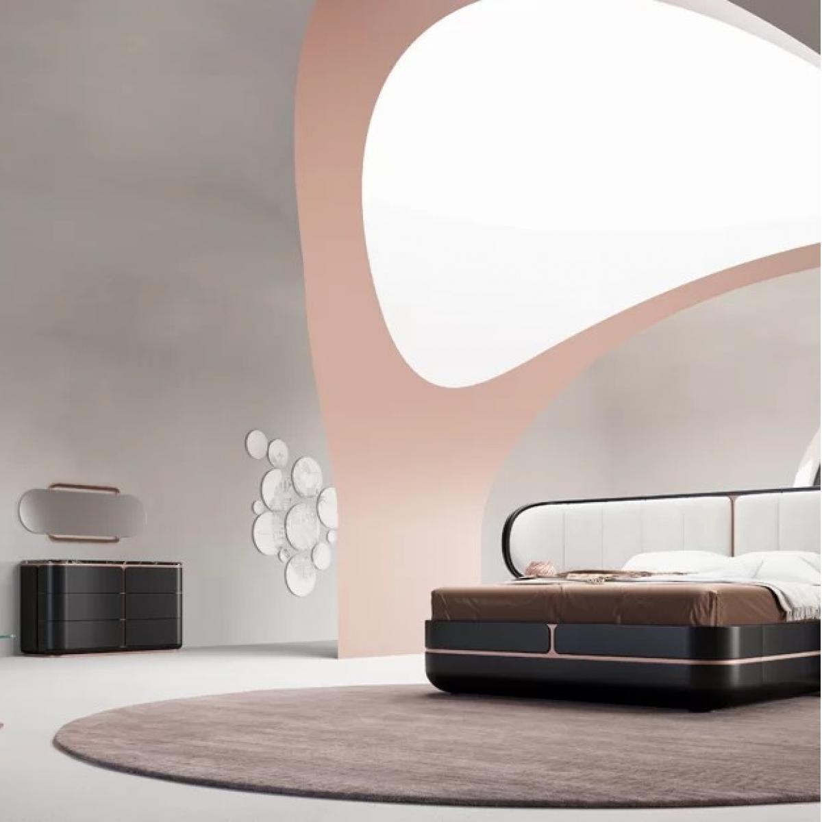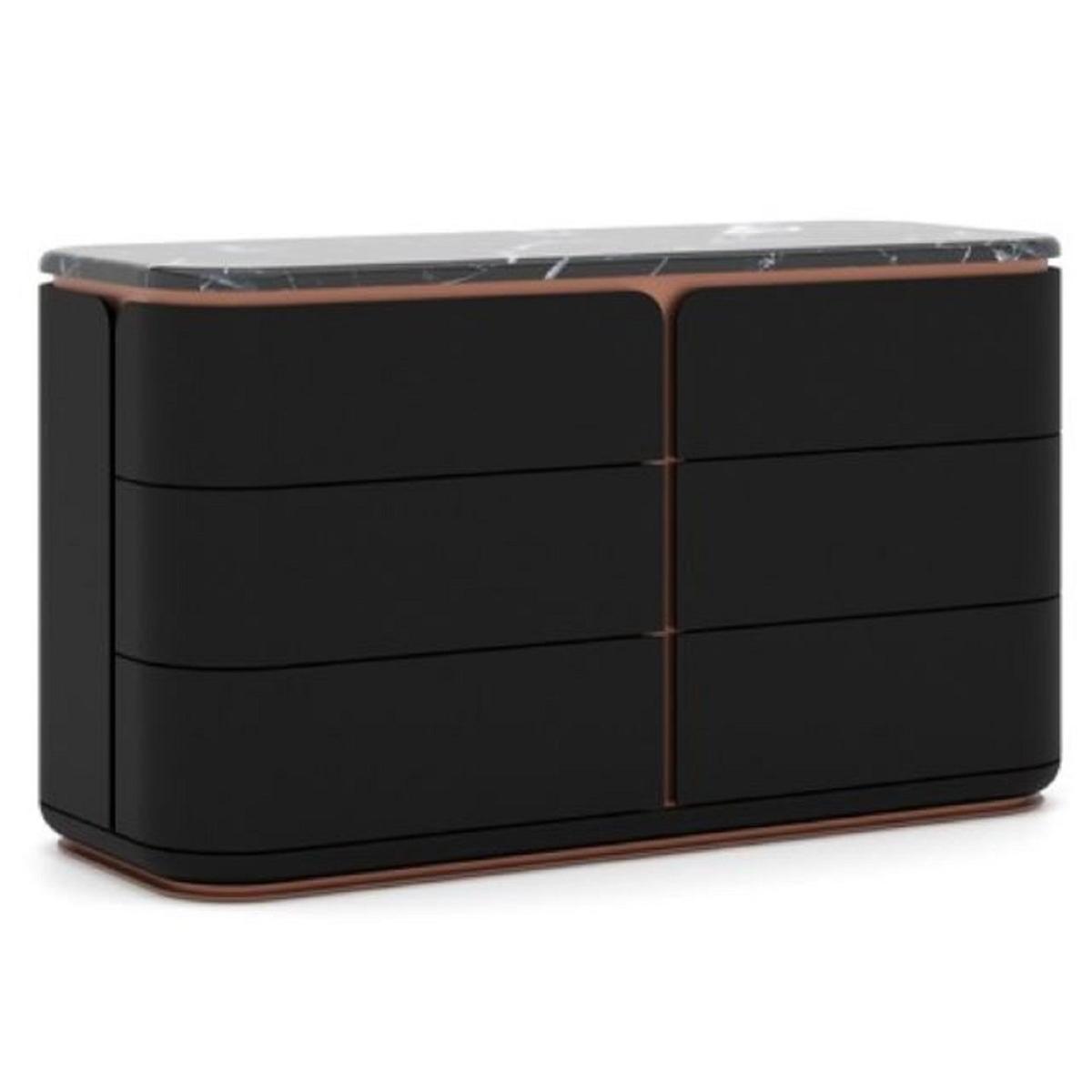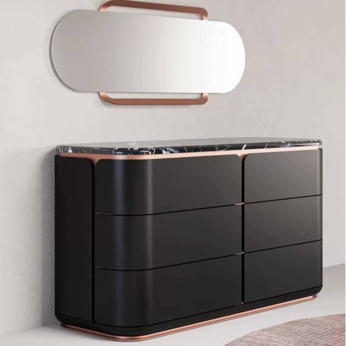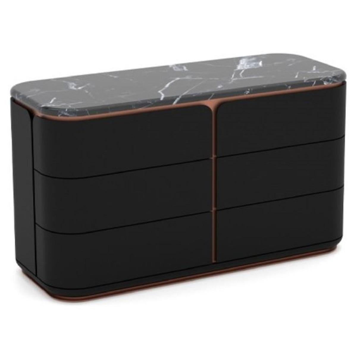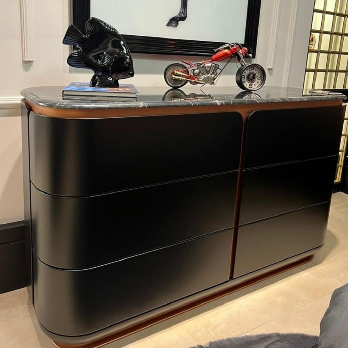 La commode de luxe est conçue avec des lignes épurées et une finition lisse, mettant en valeur son savoir-faire haut de gamme. La commode noir / cuivre s’intègre parfaitement à divers styles d’intérieur, du contemporain au classique. Sa construction en bois massif garantit une utilisation durable, tandis que les détails en cuivre ajoutent une touche de chaleur et de raffinement. Cette pièce est idéale pour ceux qui recherchent une solution de mobilier de chambre fonctionnelle et élégante, qui se démarque en tant que pièce maîtresse.