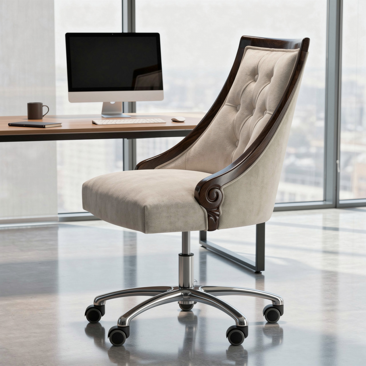 Le Fauteuil de direction de luxe capitonné en velours crème avec cadre en bois foncé et base pivotante réglable incarne un savoir-faire européen raffiné et une sophistication exécutive. Ce fauteuil de direction de luxe rembourré présente un dossier légèrement galbé orné d’un élégant capitonnage à boutons, offrant à la fois profondeur visuelle et confort ergonomique. Le velours crème moelleux accentue l’esthétique luxueuse, tandis que le cadre en bois foncé apporte un contraste chaleureux et un caractère classique. Conçu comme un fauteuil de direction design, ce modèle allie harmonieusement élégance intemporelle et performance fonctionnelle pour les environnements exécutifs modernes.