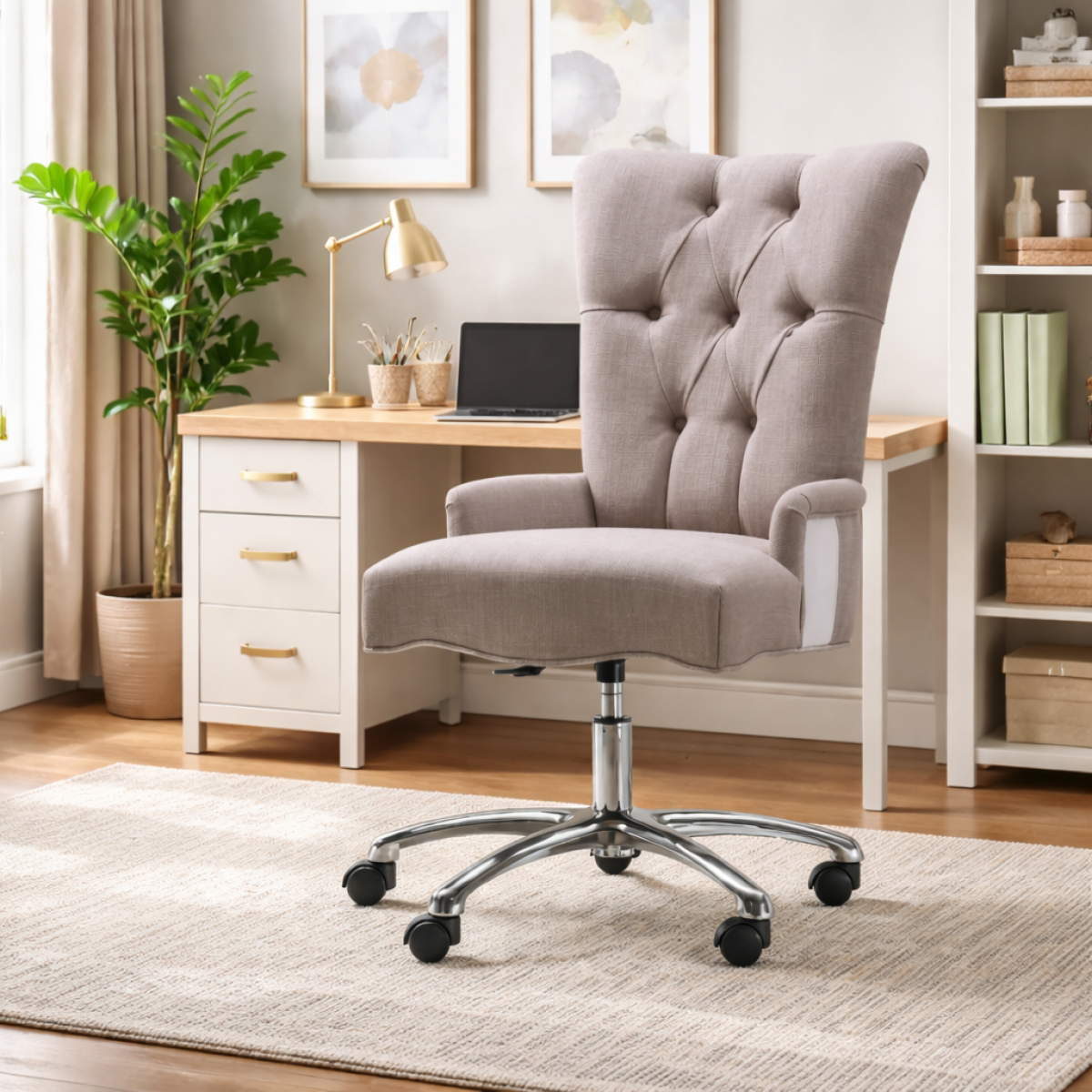 Le fauteuil de direction rembourré de luxe à dossier haut capitonné avec boutons en tissu taupe texturé et base pivotante chromée réglable allie élégance européenne raffinée et confort exceptionnel. Ce fauteuil de direction de luxe rembourré présente un dossier haut capitonné avec boutons qui offre un soutien ergonomique tout en rehaussant son apparence sophistiquée. Le tissu taupe texturé apporte chaleur et charme intemporel, tandis que les accoudoirs légèrement courbés et l’assise moelleuse garantissent un confort supérieur. La base pivotante chromée polie avec roulettes assure une mobilité fluide, faisant de ce fauteuil de direction design un choix idéal pour les bureaux exécutifs modernes et les espaces de travail de luxe à domicile.