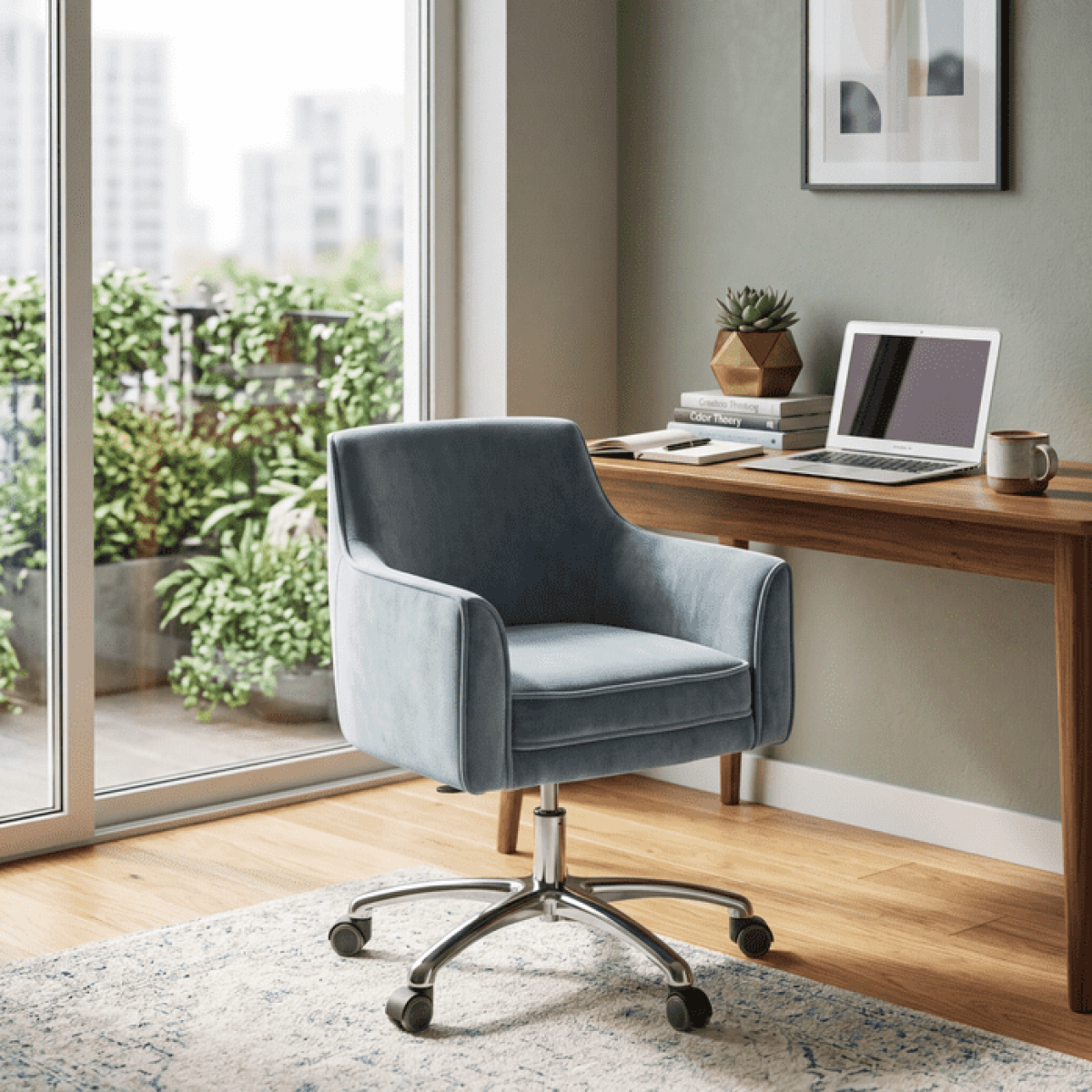 Le fauteuil de direction rembourré de luxe en velours bleu poussiéreux avec base roulante chromée réglable reflète l'élégance européenne moderne et un confort raffiné. Ce fauteuil de direction rembourré de luxe présente une silhouette doucement incurvée avec des accoudoirs légèrement rembourrés, conçus pour un soutien ergonomique lors de longues heures de travail. Le revêtement en velours bleu poussiéreux apporte une tonalité sophistiquée, tandis que la base roulante chromée polie assure une mobilité fluide et un réglage en hauteur. Conçu comme un fauteuil de direction design, ce modèle allie esthétique contemporaine et fonctionnalité pratique, idéal pour les bureaux de direction et les espaces de travail de luxe à domicile.