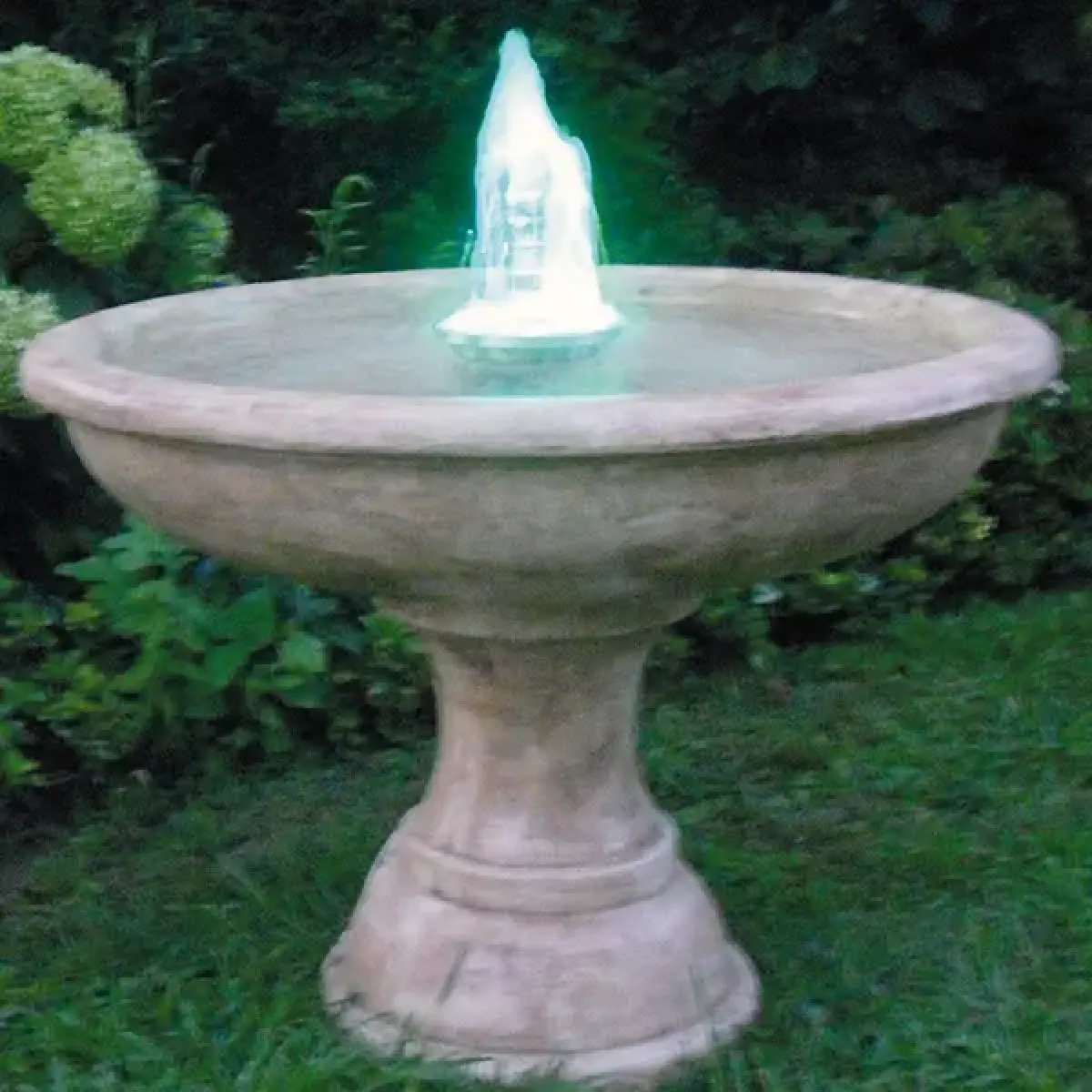 Fontaine d'eau baroque luxueuse éclairée avec bassin en forme d'assiette, jet central et base sur piédestal - Fontaine Baroque par Luxury Group International