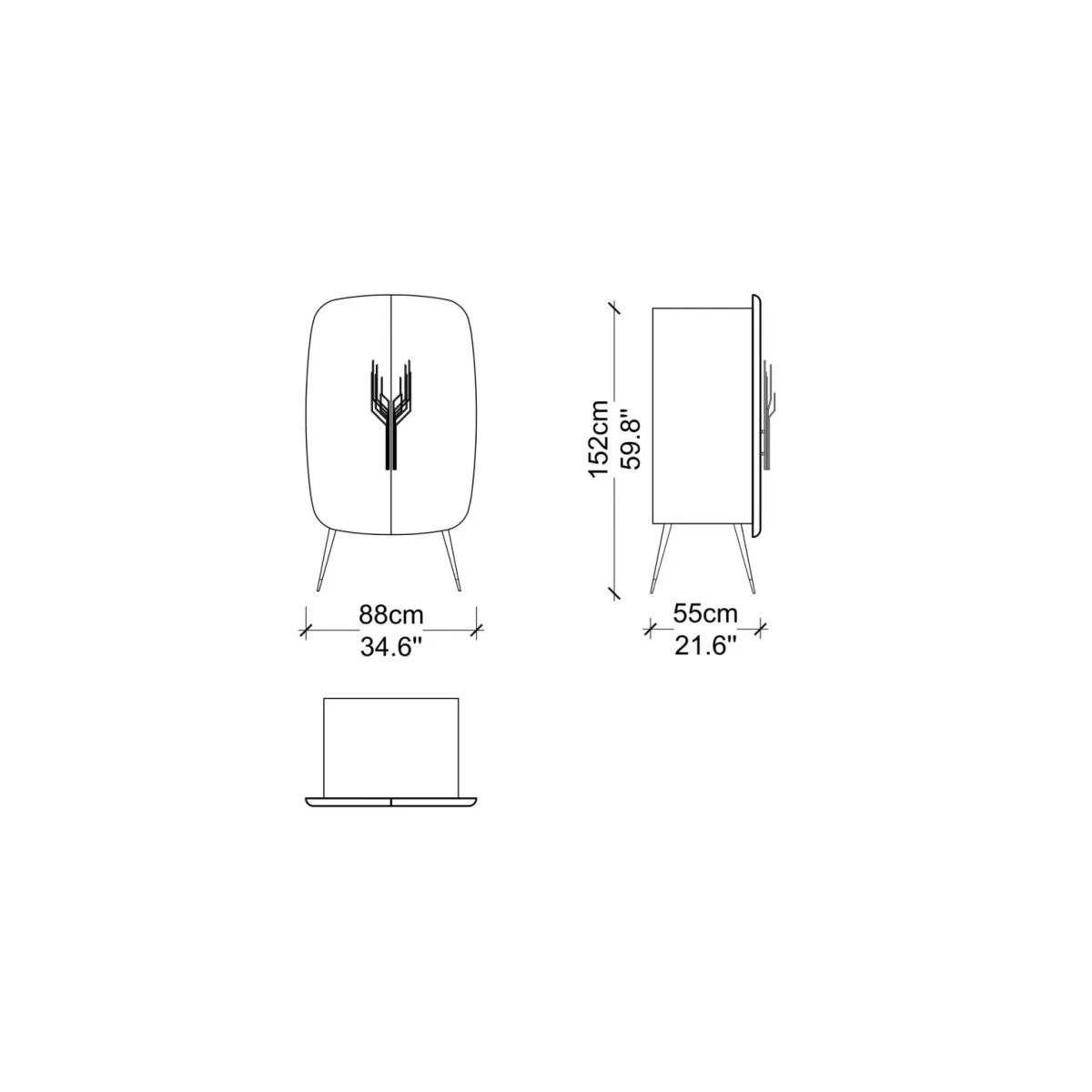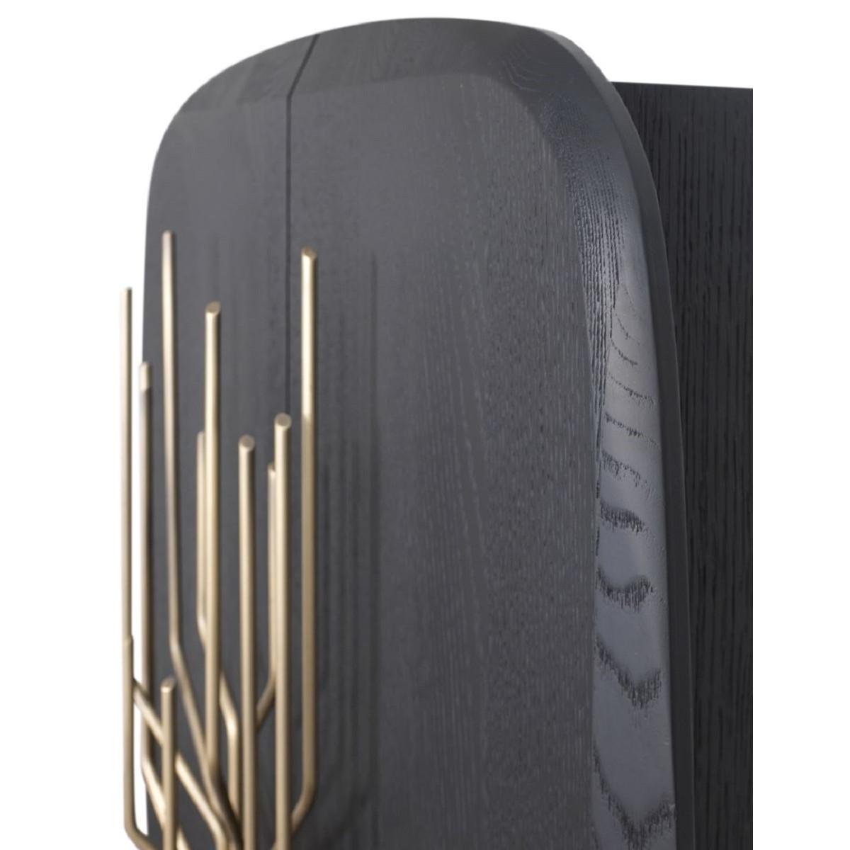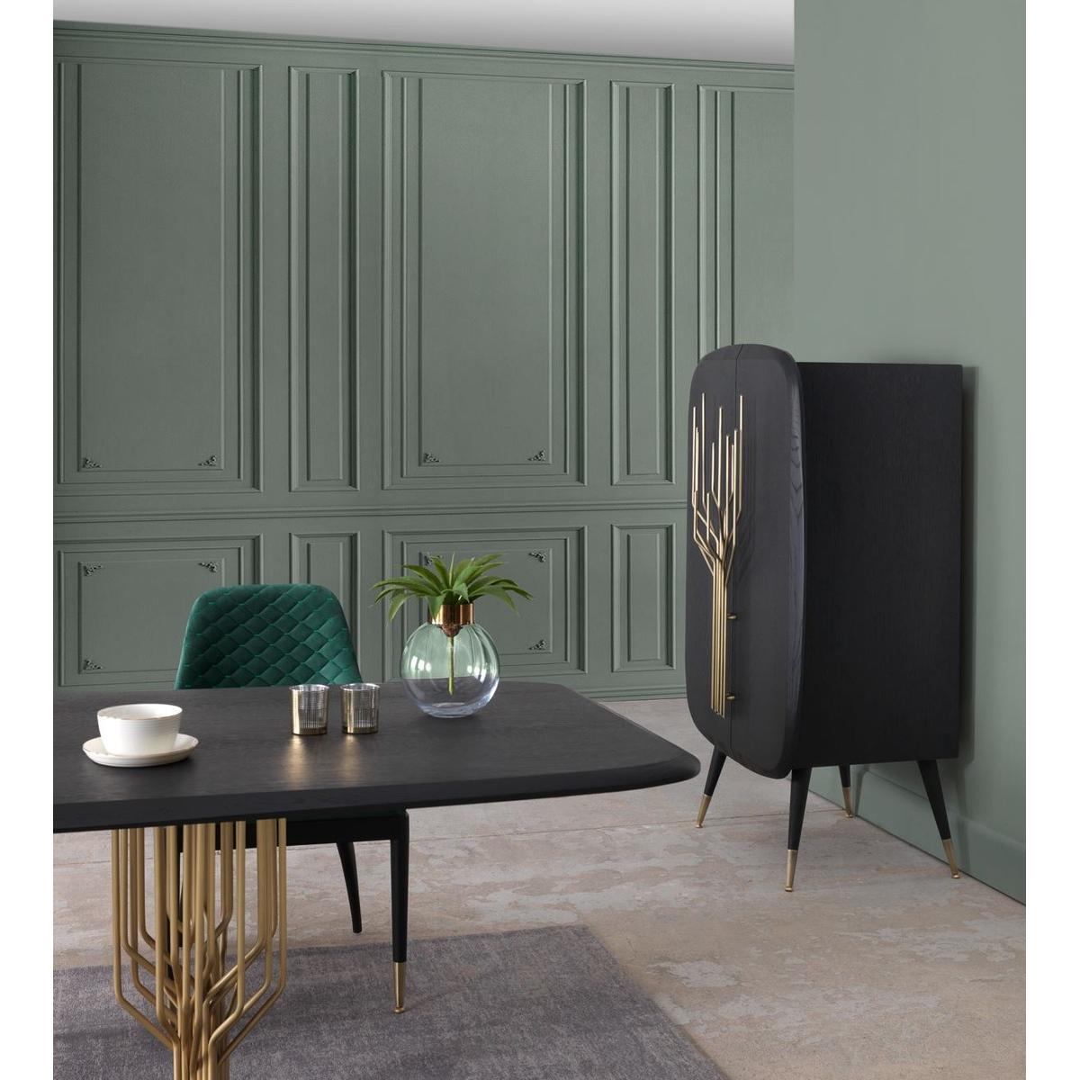 Ce qui le rend particulièrement saisissant, c’est la manière dont l’art métallique est intégré à la silhouette : deux éléments verticaux parallèles dorés s’étendent vers le bas sous le motif, faisant écho à la symétrie du motif et attirant le regard vers le centre de la façade. La forme arrondie en rectangle du meuble avec des coins adoucis renforce l’esprit milieu du siècle, créant un rythme visuel fluide de haut en bas. À l’intérieur, ce buffet à vin en bois massif avec 2 portes permet une présentation organisée des bouteilles, verrerie ou objets du quotidien. En milieu hôtelier, il s’intègre naturellement comme mobilier valorisant les espaces accueillant les clients avec une allure haut de gamme.