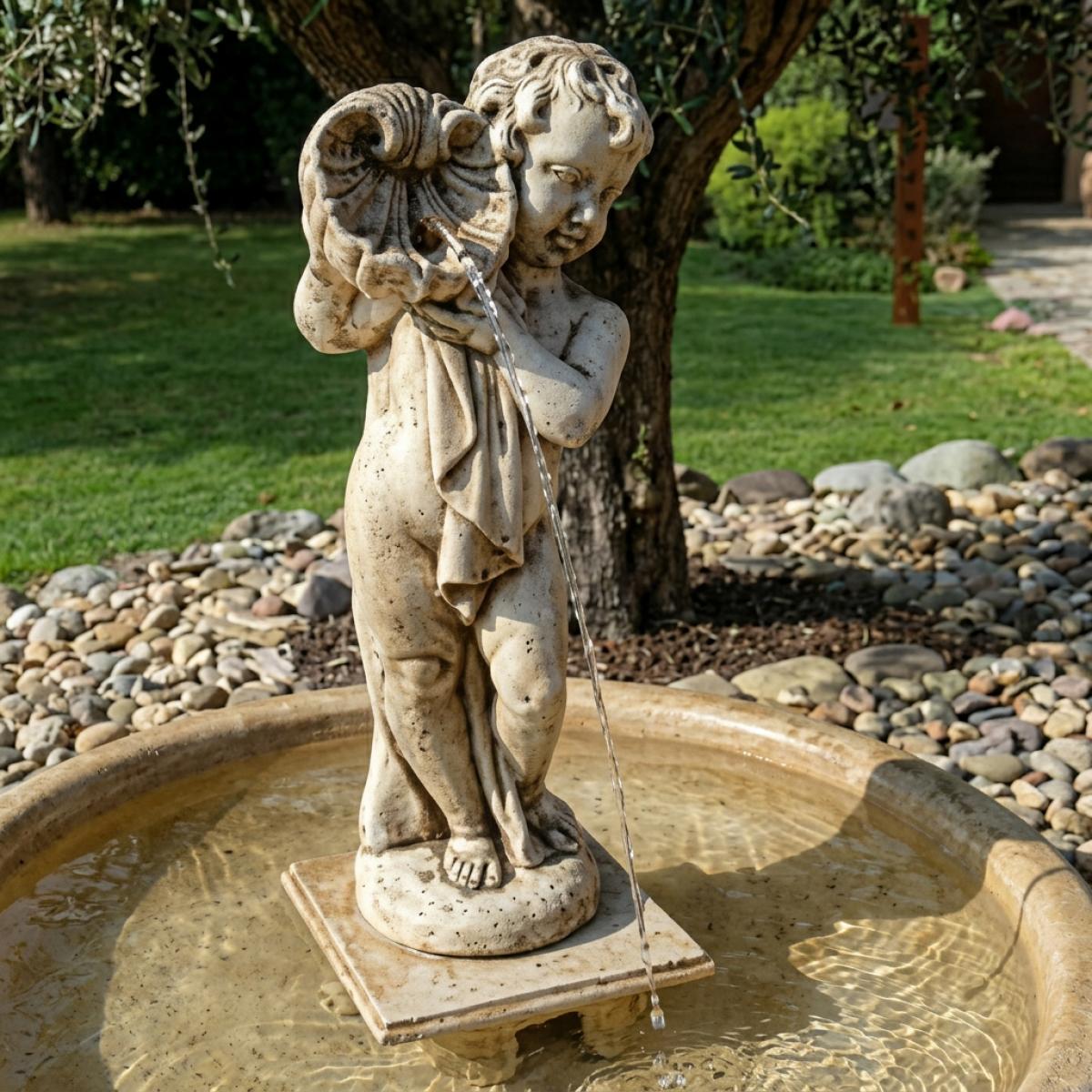 Fontaine d'eau baroque de luxe avec chérubin, vasque en coquillage et socle à bassin circulaire - Fontaine baroque par Luxury Group International