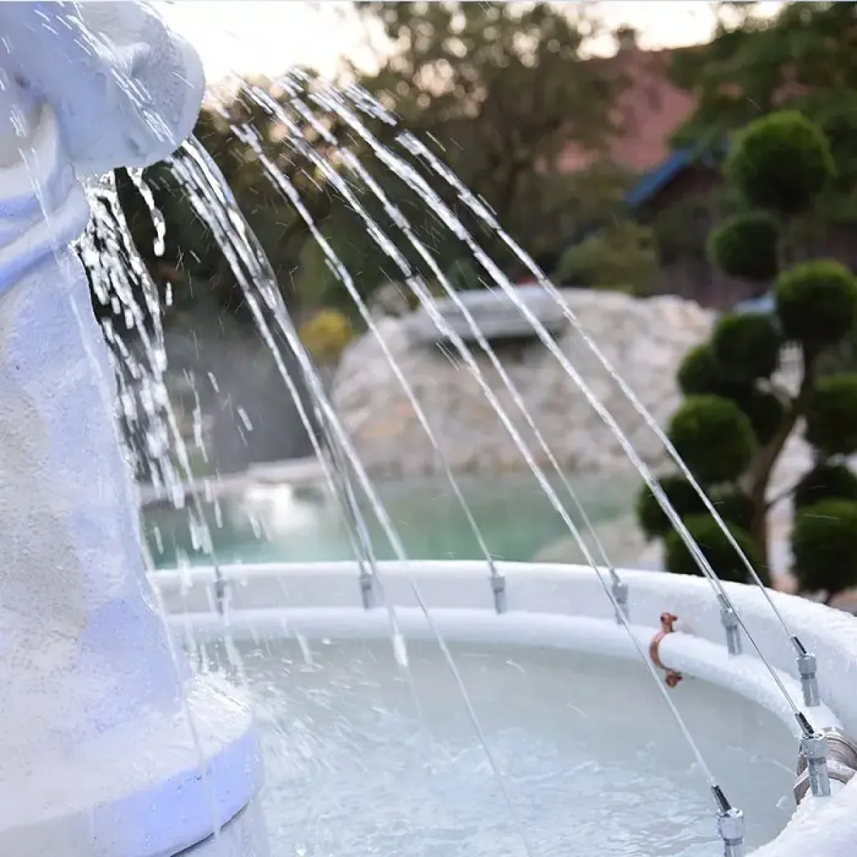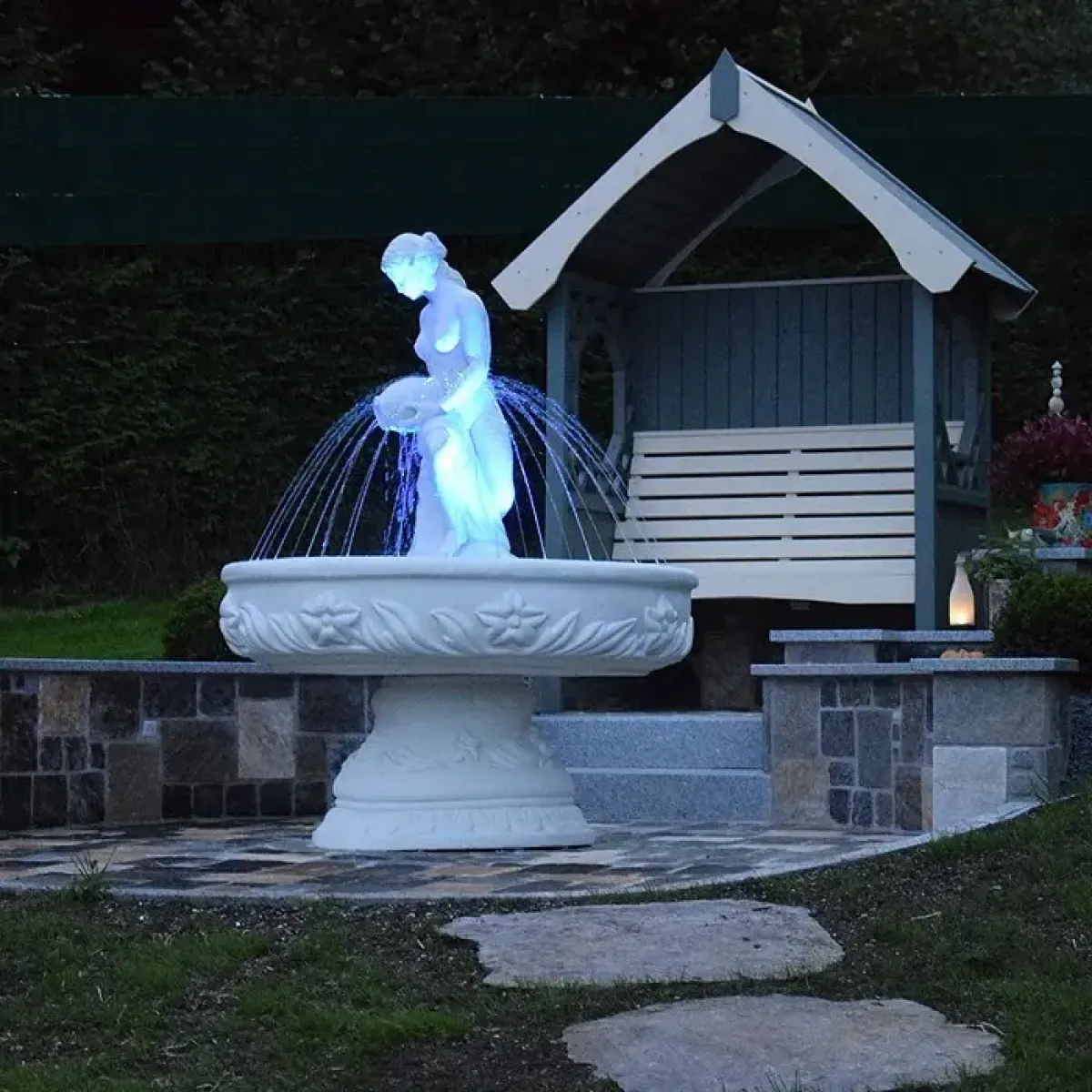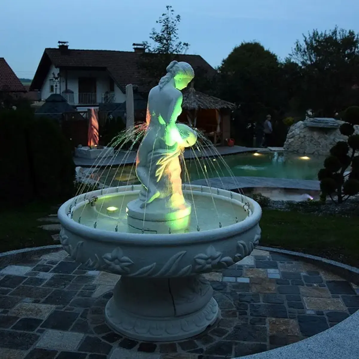 Fontaine d'eau de luxe baroque avec sculpture féminine et système de jets rayonnants dans un bassin circulaire est une fontaine baroque exceptionnelle incarnant l’élégance du design classique des jardins européens. En son centre, une figure féminine finement sculptée tient gracieusement un vase, laissant l’eau s’écouler en arcs symétriques. Cette fontaine expressive crée un captivant sentiment de mouvement et d’équilibre, transformant jardins et espaces extérieurs en environnements sereins et visuellement saisissants.