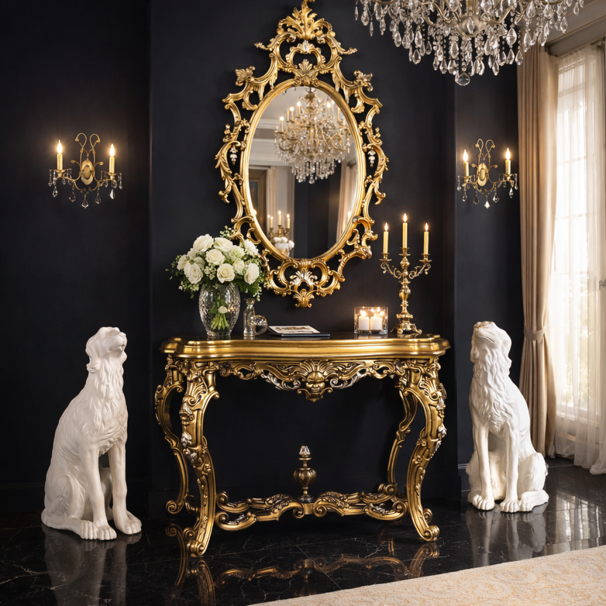 Pour étendre la grandeur de ce chef-d’œuvre baroque dans chaque recoin de votre résidence distinguée avec une cohérence totale, nous vous invitons chaleureusement à découvrir notre collection de commodes de luxe, chacune conçue avec la même dévotion à l’artisanat sculpté à la main et à la finition en feuilles artisanales — un compagnon inspiré pour une suite principale, un dressing privé ou un salon de réception majestueux composé avec un goût et une vision sans compromis. Pour ceux qui souhaitent acquérir le miroir comme trésor décoratif autonome, il est également disponible indépendamment dans notre collection de miroirs baroques de luxe, où son cadre ovale ajouré dramatique se présente comme l’un des objets décoratifs les plus extraordinaires de toute la tradition baroque européenne. Qu’il soit présenté en ensemble complet ou en pièces maîtresses choisies individuellement, cet ensemble console miroir baroque pour intérieur représente le summum de l’artisanat baroque continental et de la grandeur intérieure palatiale.