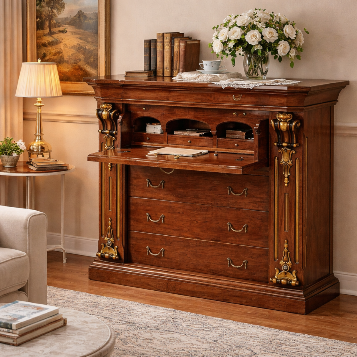Commode Secrétaire en Bois Baroque de Luxe avec Bureau Abattant et Rangement Multi-Tiroirs est une commode de luxe raffinée conçue pour apporter l'élégance classique européenne et une fonctionnalité pratique aux intérieurs sophistiqués. Faite en bois de qualité supérieure avec une finition noyer riche, cette commode en bois baroque présente des colonnes sculptées décoratives, des poignées de style ancien et un élégant compartiment bureau abattant. Le rangement pensé inclut plusieurs tiroirs et compartiments cachés, offrant à la fois organisation et un attrait visuel intemporel. Sa structure architecturale et ses détails classiques font de ce meuble un choix idéal pour les salons, chambres ou espaces d'étude élégants.