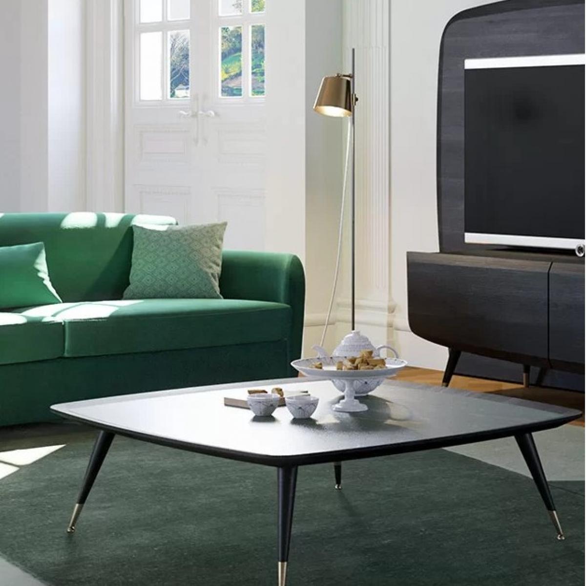 La table basse noire est soutenue par des pieds élégants finis en laiton antique, créant un contraste saisissant qui valorise son attrait esthétique global. Cette combinaison de matériaux assure non seulement la stabilité mais introduit également un charme vintage qui complète divers styles d’intérieur, du moderne au classique. La hauteur de 38 cm est parfaite pour un accès confortable depuis les canapés et fauteuils lounge, alliant ainsi praticité et attrait visuel.