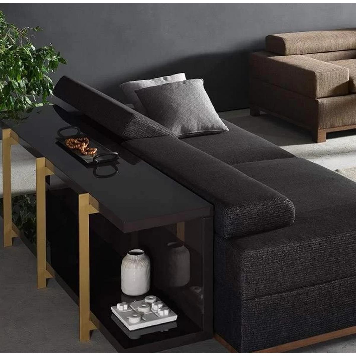 Ce qui distingue vraiment cette pièce, c’est son design architectural frontal. La console est formée par trois compartiments ouverts à l’avant, séparés par deux diviseurs verticaux en métal doré. Ces diviseurs créent des zones définies pour le rangement des médias tout en servant d’éléments structurels qui attirent le regard vers le haut et soulignent la géométrie aux bords droits de la pièce. À l’intérieur, vous trouverez des panneaux arrière intérieurs foncés et des surfaces d’étagères visibles qui aident à séparer visuellement les objets, pour que votre installation reste ordonnée même lorsque les compartiments sont ouverts. Une étagère/partition horizontale est visible à l’intérieur des compartiments, offrant un support pratique pour les accessoires médias et évitant l’encombrement. Parcourez notre collection de consoles de luxe pour découvrir des designs raffinés qui ajoutent élégance et fonctionnalité aux intérieurs sophistiqués.