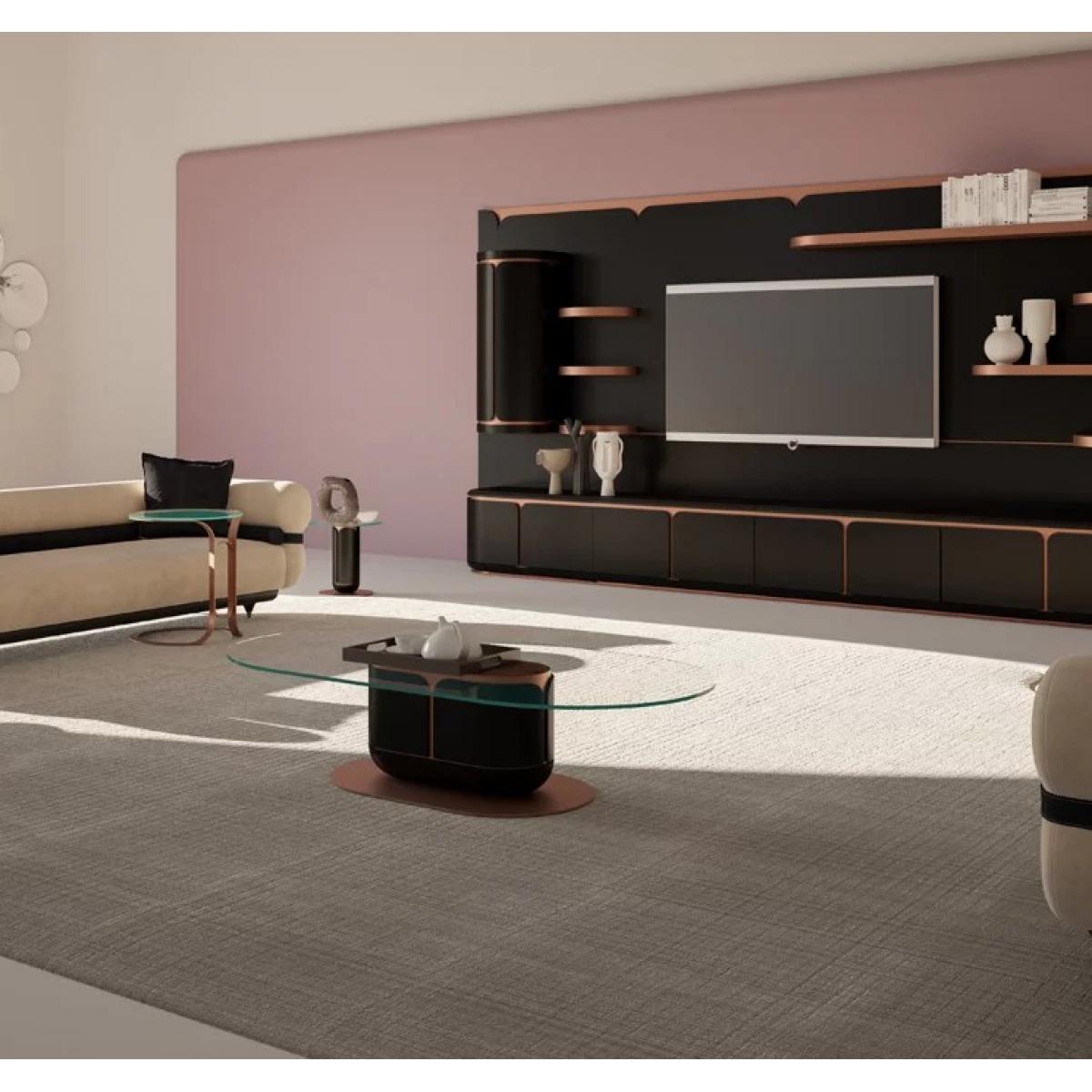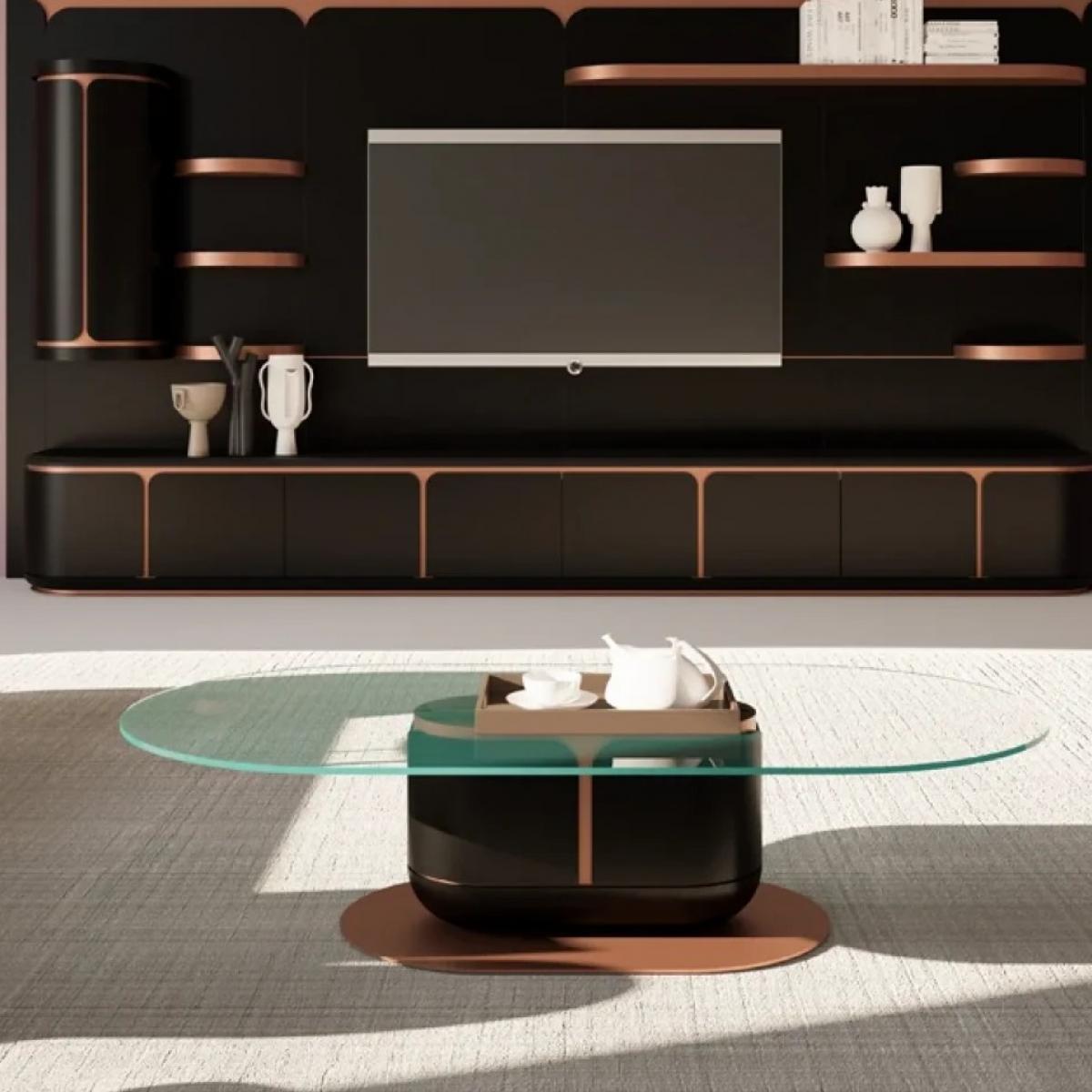 Cette table basse de luxe se distingue par ses détails uniques en cuivre qui accentuent la base marron, créant un contraste raffiné qui attire le regard. Le plateau en verre ajoute non seulement une finition élégante mais permet aussi de laisser visible le design complexe de la base, apportant profondeur et caractère à la pièce. Les dimensions de la table, 150 x 80 x H. 40 cm, en font une taille idéale pour les salons, offrant une surface généreuse sans encombrer l’espace. Sa forme ovale favorise une circulation aisée autour de la table, améliorant son utilisation tant en milieu résidentiel que commercial.