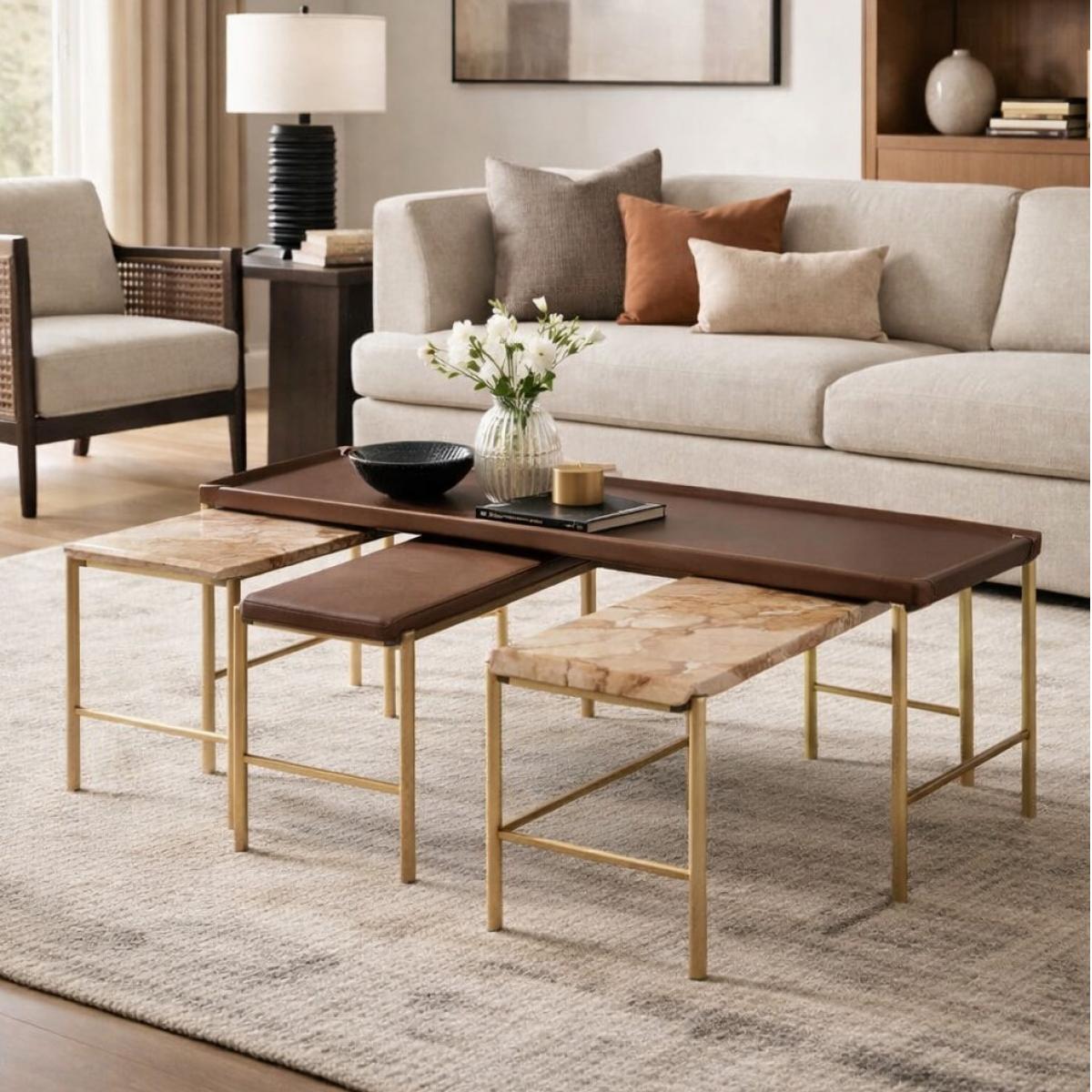 Avec son design élégant et ses matériaux de haute qualité, l'ensemble de 4 tables basses de luxe constitue un centre d'attention parfait pour les salons sophistiqués. L'association de marbre, bois et laiton crée un équilibre esthétique qui complète divers styles d'intérieur, du contemporain au classique. Cet ensemble ne sert pas seulement de mobilier pratique, mais aussi de pièce maîtresse qui élève l'ambiance de votre maison par sa présence raffinée et luxueuse. Découvrez plus de tables basses élégantes dans nos collections tables basses de luxe.