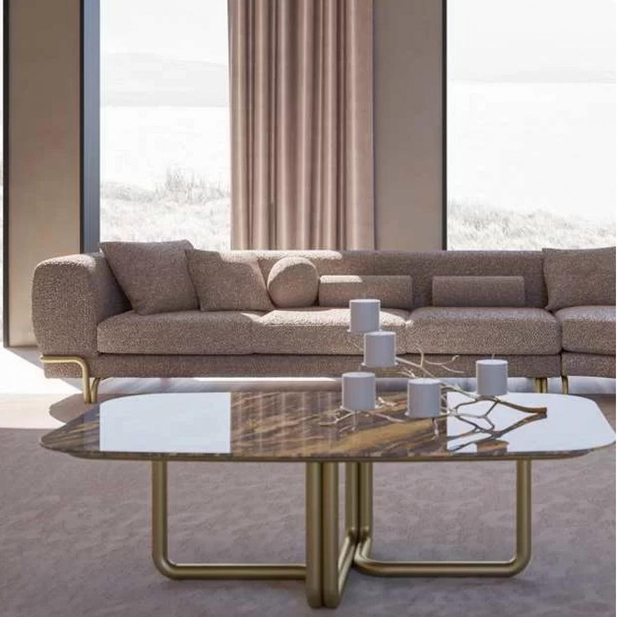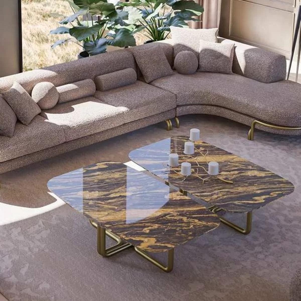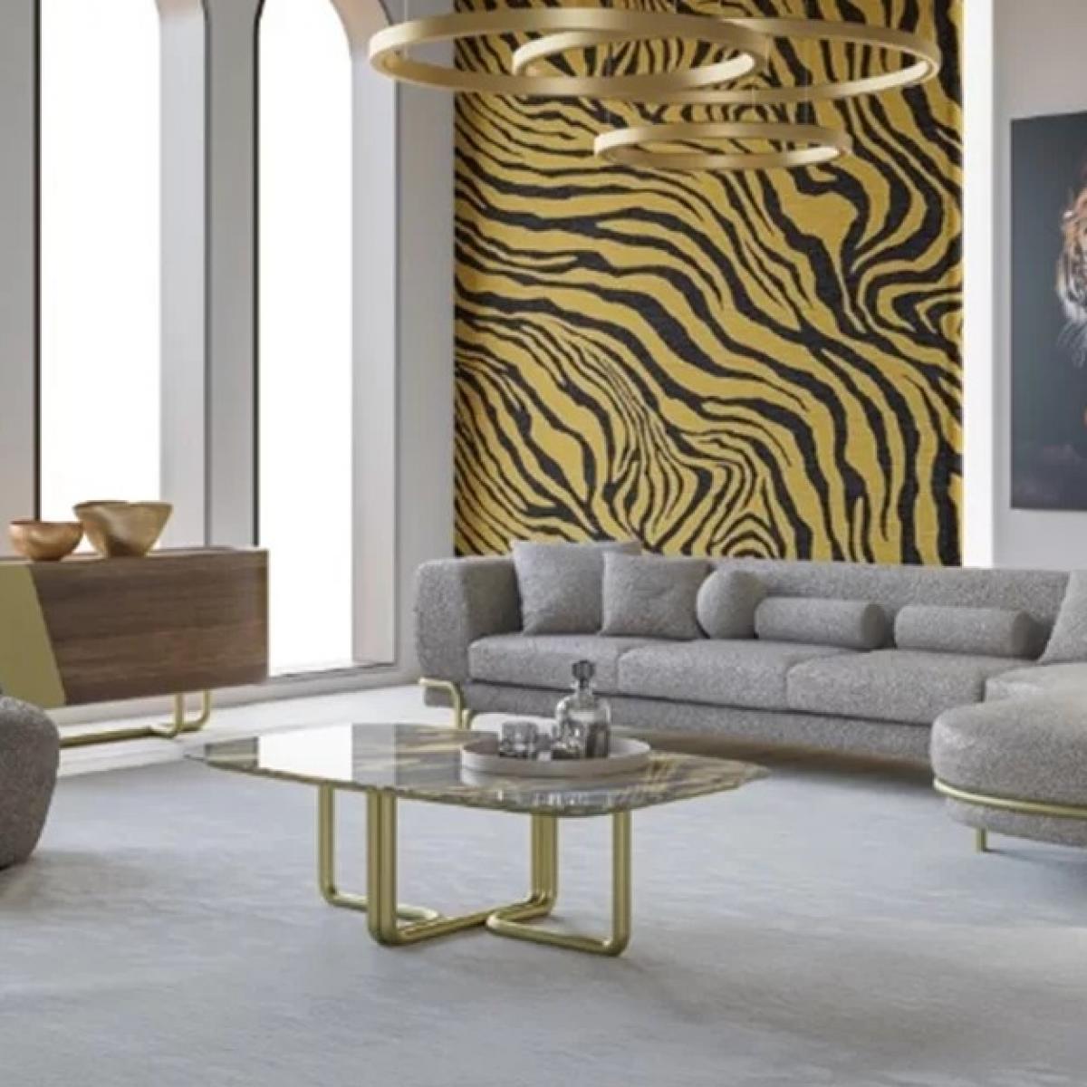 Le socle de cette table basse à plateau en marbre est réalisé avec des pieds dorés qui assurent à la fois stabilité et un attrait visuel luxueux. La finition métallique complète magnifiquement le plateau en marbre gris, créant un contraste saisissant qui met en lumière le savoir-faire raffiné de la table. Le design unique des pieds ajoute un élément artistique, faisant de cette table basse à plateau rectangulaire en marbre une pièce fonctionnelle et artistique qui rehausse l’ambiance de toute pièce.