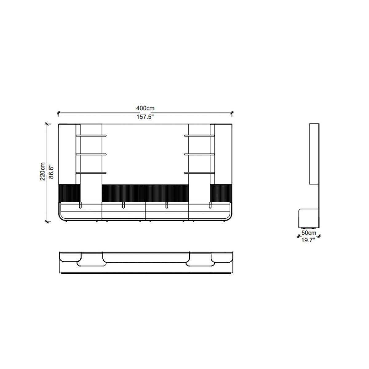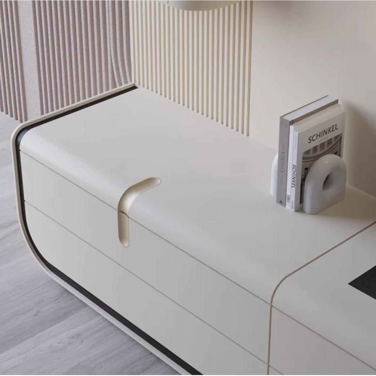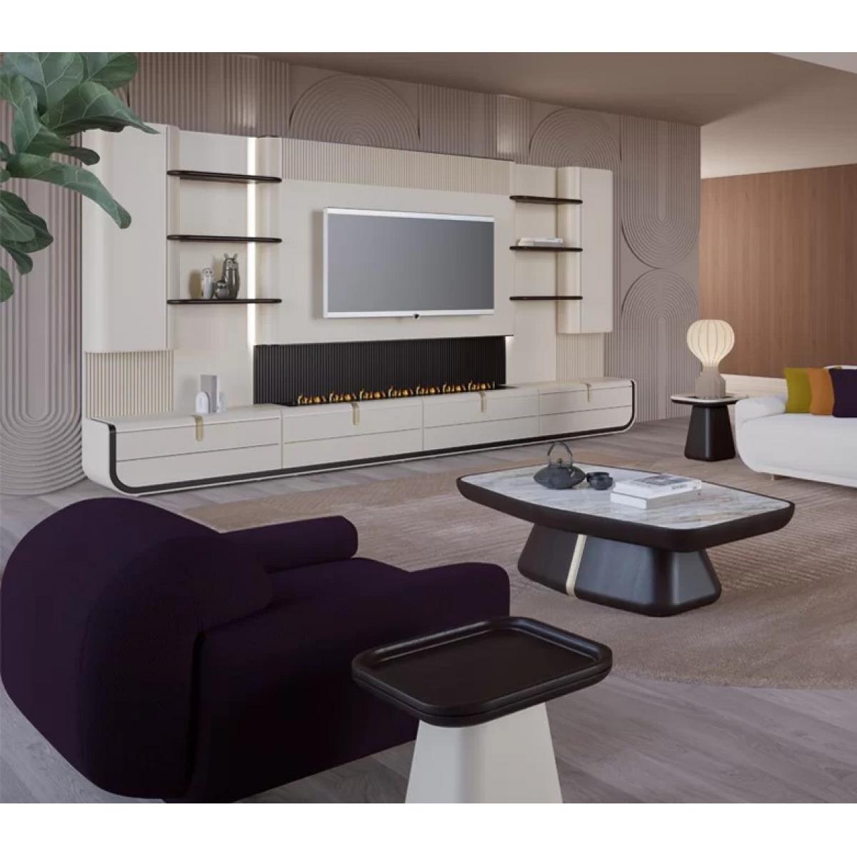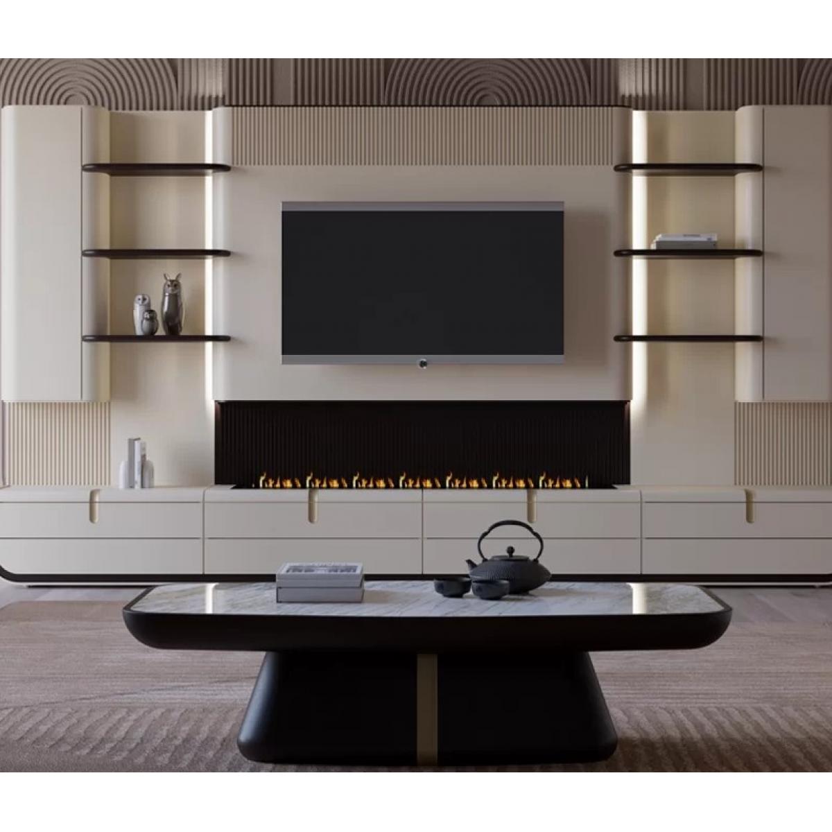 La partie inférieure est conçue pour une organisation pratique des médias, combinant tiroirs et portes de placard séparés en sections rectangulaires nettes. Des poignées barres simples facilitent l’accès au rangement, tandis que des inserts de panneaux latéraux nervurés verticaux près des coins inférieurs ajoutent texture et style distinctifs. Ensemble, la niche TV centrale, la cheminée encastrée et les étagères latérales équilibrées créent un aspect intégré adapté à un usage quotidien en salon adulte comme aux espaces inspirés d’hôtels. Avec sa silhouette contemporaine moderne et son contraste solide blanc cassé et noir, ce meuble multimédia fonctionne parfaitement comme point focal. Sublimez encore votre espace de divertissement en explorant notre collection de meubles TV de luxe, conçue pour allier design élégant et sophistication fonctionnelle. Associez ce meuble à la Table basse rectangulaire de luxe avec plateau en marbre blanc, conçue pour introduire une élégance intemporelle et une fonctionnalité raffinée dans les espaces de vie sophistiqués.