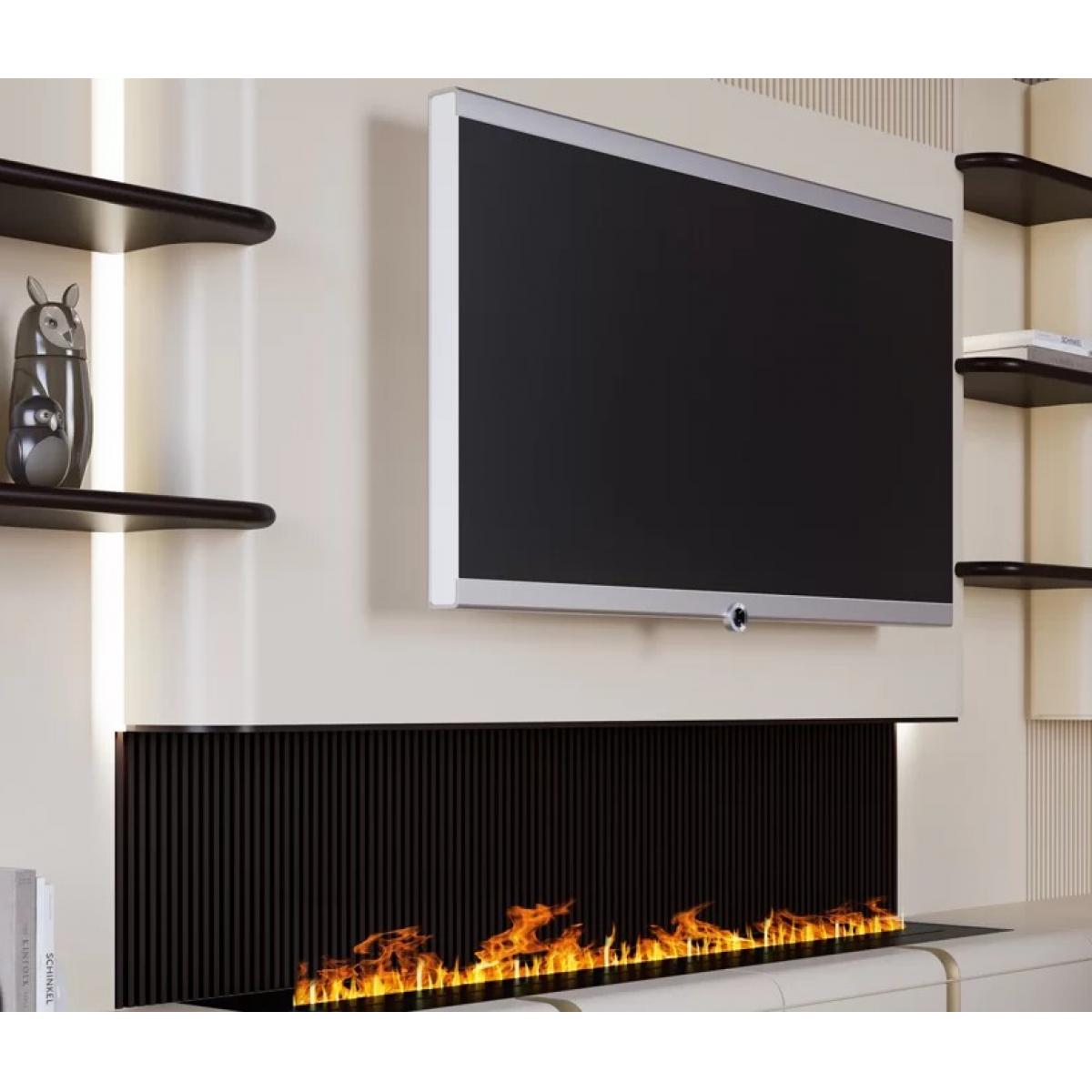 La fonctionnalité du meuble TV est mise en valeur par l’ouverture rectangulaire centrale pour TV avec un écran gris foncé. Juste en dessous, l’insert cheminée électrique encastré présente un effet de flammes visibles aux tons orange chaleureux, créant une atmosphère cosy sans le désordre d’un feu réel. Des compartiments à étagères ouvertes flanquent la TV pour une présentation flexible de décorations, livres ou appareils électroniques, tandis que des étagères horizontales sombres et un fond ajoutent profondeur et rythme visuel structuré.