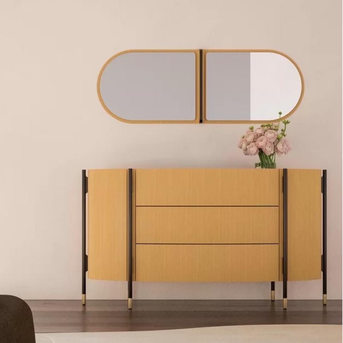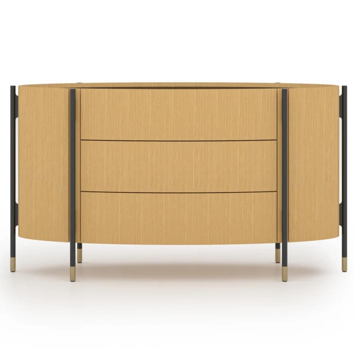La Commode de Luxe à 4 Portes Naturel / Noir / Laiton - Mobilier d'Hôtel Élégant est une pièce maîtresse conçue pour sublimer tout espace de vie grâce à son charme sophistiqué. Faite avec une finition en bois naturel, cette commode allie chaleur organique et esthétique moderne. Les courbes douces du corps de la commode et les lignes épurées de ses quatre portes créent un équilibre harmonieux entre design contemporain et élégance intemporelle. Le dessus noir apporte un contraste saisissant, renforçant l'attrait visuel global tout en offrant une surface durable pour les objets décoratifs ou les essentiels quotidiens.