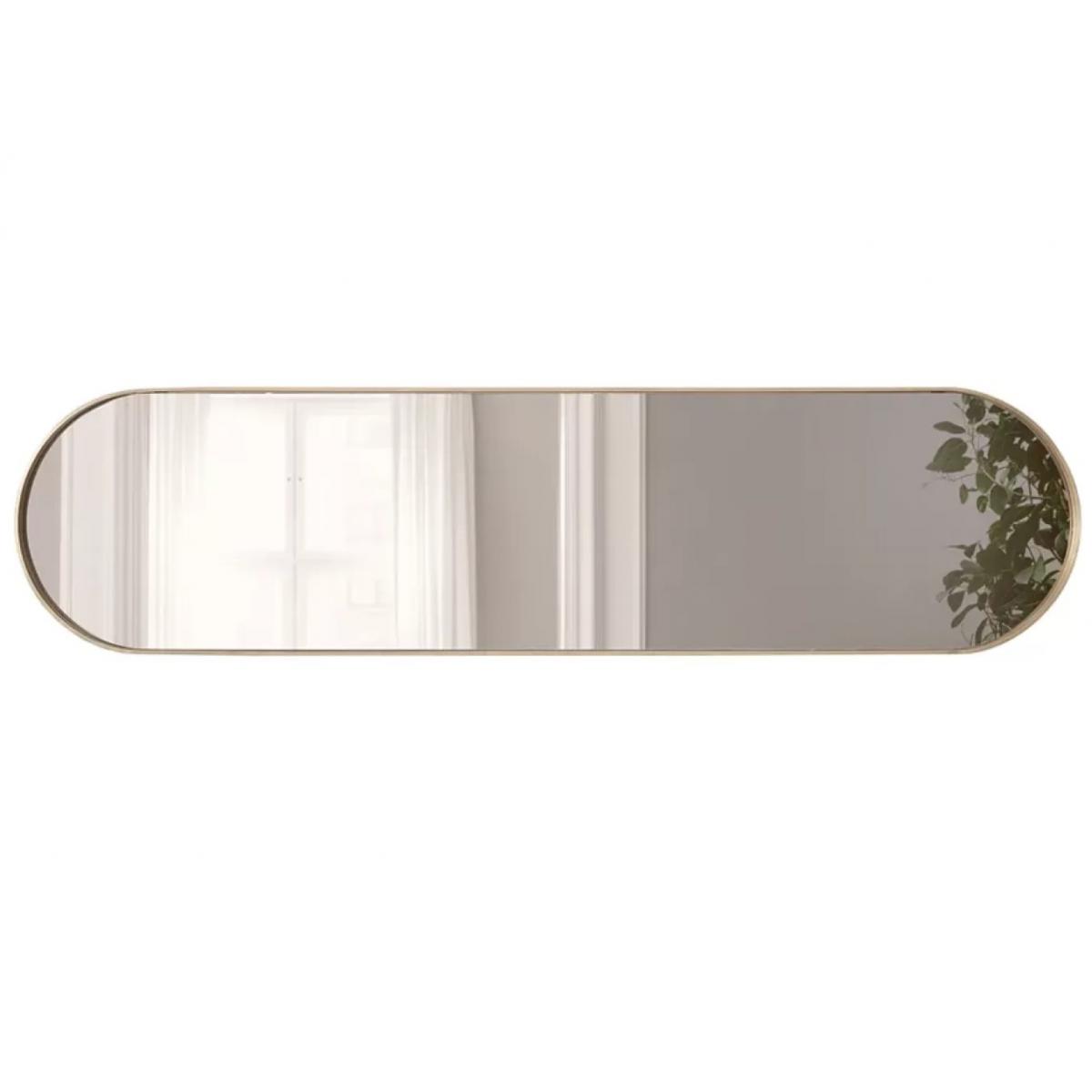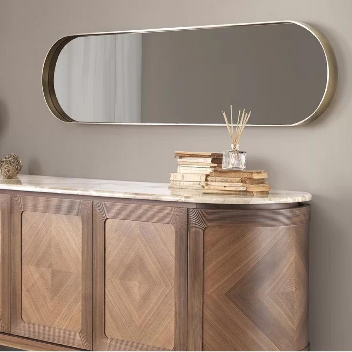 Le cadre en métal doré crée une ligne périphérique continue d’épaisseur constante autour de toute la forme, renforçant la sensation d’ordre et de proportion. Les coins extérieurs arrondis adoucissent le panneau horizontal allongé, équilibrant la silhouette qu’on l’observe de près ou de loin. À l’intérieur, la surface uniforme blanc crème reste lisse et sans ornements, soutenant un style décoratif moderne compatible avec une large gamme de mobiliers. Associez ce miroir au Buffet Ovale en Bois Massif de Luxe pour créer un point focal raffiné qui rehausse la chaleur, l’équilibre et l’élégance intemporelle de votre intérieur.