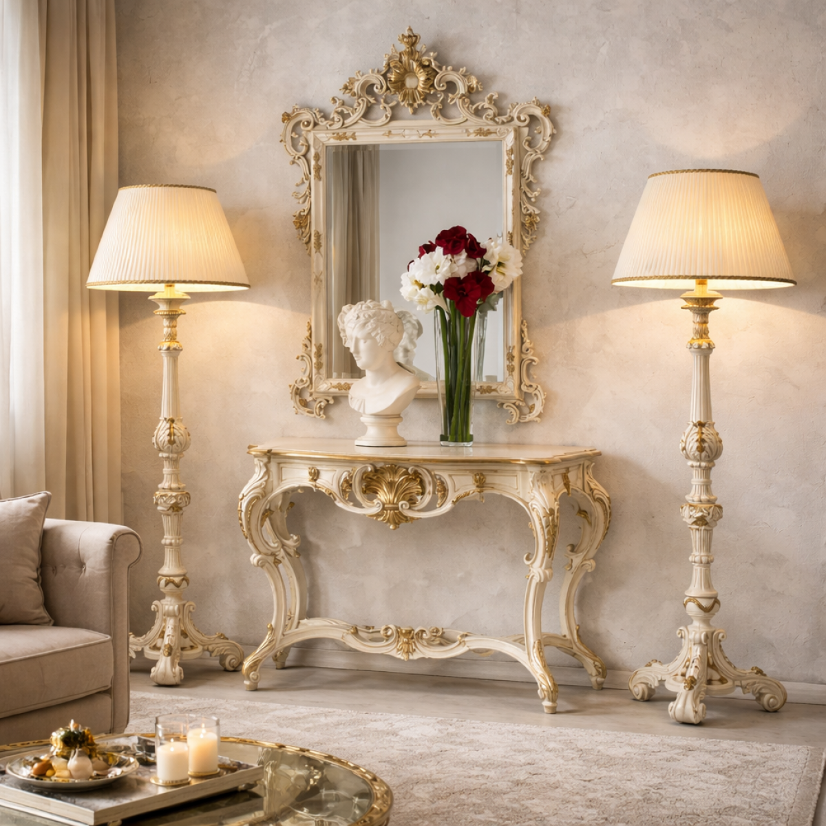 Les amateurs d’arts décoratifs européens classiques sont chaleureusement invités à explorer notre collection complète et sélectionnée d’ensembles consoles miroirs baroques de luxe, où chaque pièce a été choisie pour son authenticité à la tradition baroque et sa capacité à sublimer les intérieurs contemporains les plus distingués. Pour ceux qui préfèrent une élégance plus froide et argentée, notre Ensemble Console Miroir Baroque de Luxe en Feuille d’Argent avec Volutes d’Acanthe Ornées offre une alternative convaincante — sa finition unifiée argent sur argent offrant une présence tout aussi imposante dans des décors aux tons pierre, gris ou ivoire froid.