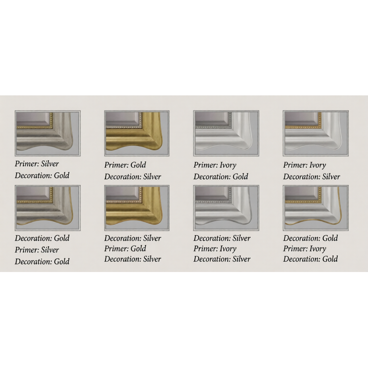 Ce set est présenté en huit combinaisons distinguées d’apprêt et de décoration : Ivoire avec Argent, Ivoire avec Or, Argent avec Or, Or avec Argent, Argent avec Argent, Or avec Or, Argent avec Or, et Or avec Argent — chacune créant une interaction distinctive de tons métalliques et de surfaces finies à la main. D’autres options personnalisées d’apprêt et de décoration sont disponibles sur demande, garantissant que votre ensemble soit réalisé avec une précision totale selon votre vision intérieure individuelle.