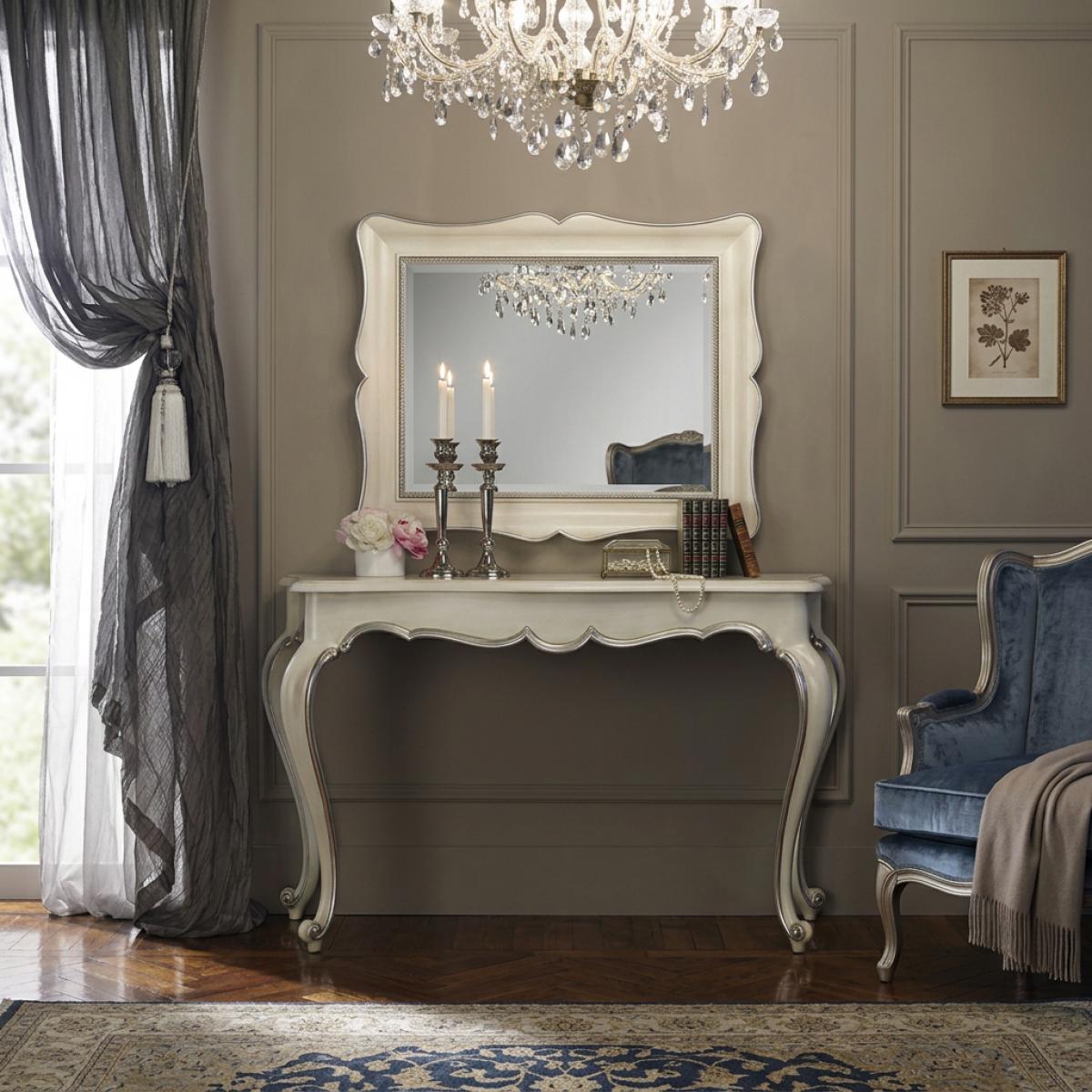 L’Ensemble Console Miroir Baroque Ivoire de Luxe avec Cadre Argenté Festonné & Bordure Intérieure Perlée représente un chapitre discrètement imposant de la tradition décorative baroque européenne — où la grandeur s’exprime par la pureté des formes, la précision du détail artisanal et l’interaction maîtrisée de l’ivoire et de l’argent. Cet ensemble console miroir baroque de luxe comprend une console en bois massif sculpté à la main avec un plateau MDF premium, associée à un cadre de miroir en bois massif sculpté, chaque surface étant finie individuellement par des artisans européens accomplis en apprêt ivoire avec une décoration en feuille d’argent appliquée à la main sur les bords. La console présente un tablier festonné serpentin lisse d’une clarté architecturale, soutenu par de hauts pieds cabriole élancés qui s’affinent en pieds enroulés sculptés à pointe argentée avec une aisance naturelle. Le large miroir au format paysage suit un profil extérieur festonné gracieux, son bord intérieur étant défini par une fine bordure perlée argentée qui encadre le verre avec une élégance discrète et réfléchie. Ensemble, la composition ivoire et argent rayonne d’une luminosité fraîche et sereine, adaptée aux intérieurs européens les plus raffinés.