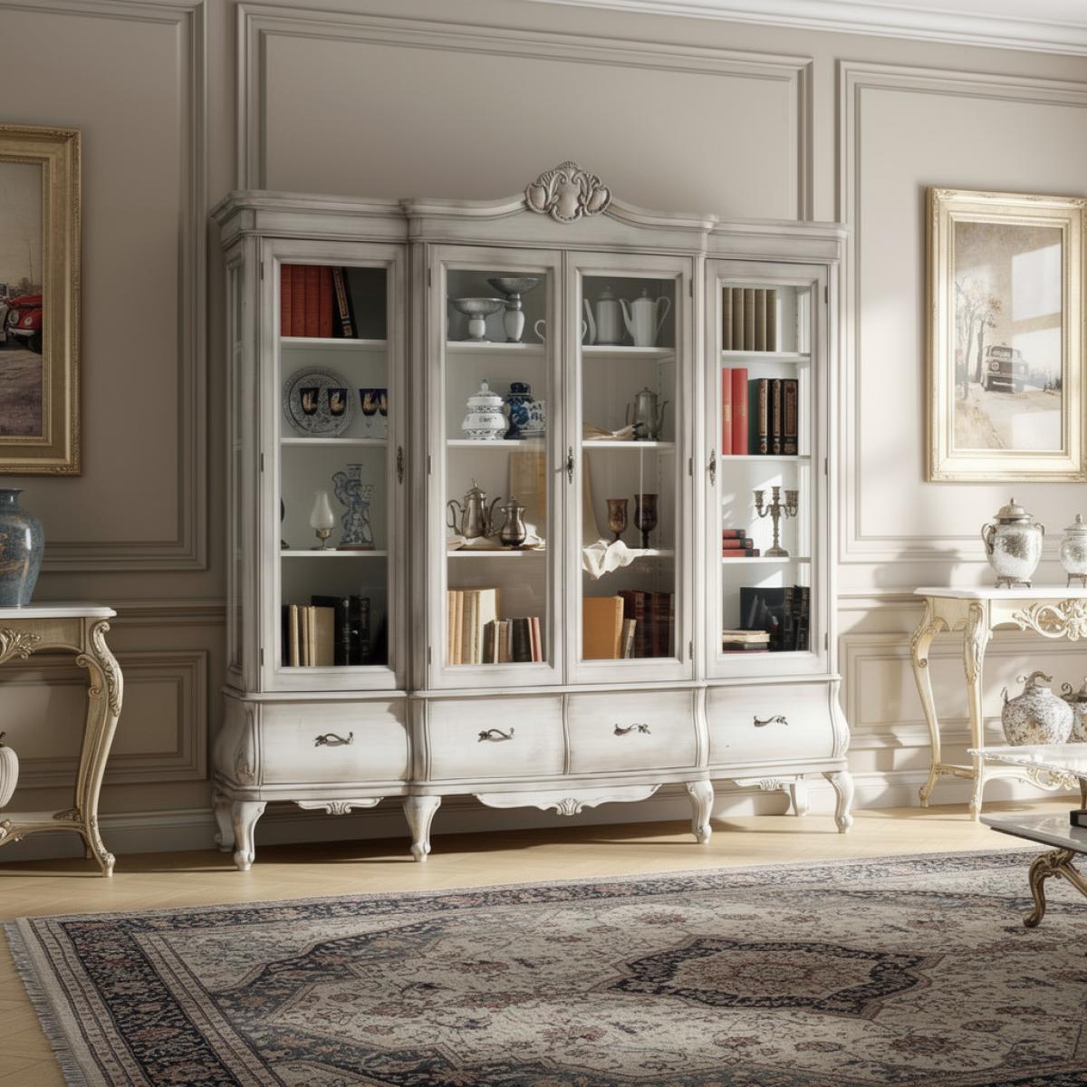 Vitrine de Luxe Baroque Ivoire à Portes Multiples en Verre avec Cimaise Sculptée & Base de Rangement Courbée apporte une atmosphère de galerie instantanée à votre espace, mêlant le drame orné baroque à une praticité quotidienne. Cette vitrine de luxe est conçue pour un look soigné dans le salon, où la présentation à portes vitrées permet à votre verrerie, décorations et objets de collection préférés de rester visibles tout en étant protégés du désordre quotidien. L’esthétique en bois peint ivoire élève la pièce avec une présence lumineuse et intemporelle, tandis que la disposition à portes multiples crée un rythme raffiné à la fois élégant et fonctionnel.
