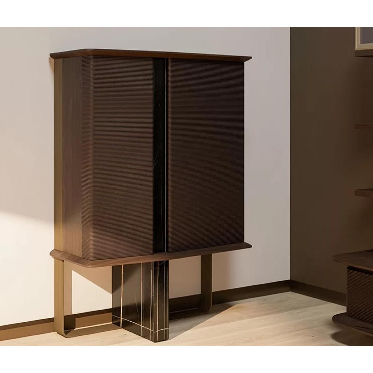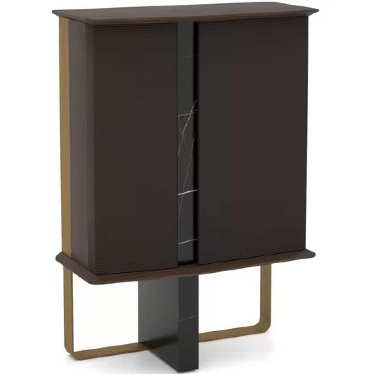 Apportez une touche affirmée et haut de gamme à votre espace avec ce buffet bar moderne de luxe en placage chêne mat brun foncé avec marbre noir et base dorée — conçu pour un look raffiné inspiré des hôtels. Le caractère sombre du buffet bar noir brun est ancré dans le bois massif avec une présence en placage chêne, créant un fond riche pour la silhouette audacieuse du meuble. Une couture verticale visible divise le devant en deux panneaux nets, ajoutant un équilibre architectural tout en gardant le design visuellement organisé. La finition globale est mate et discrète, aidant le meuble à paraître élégant plutôt que tape-à-l’œil.