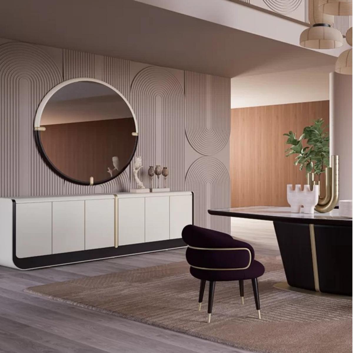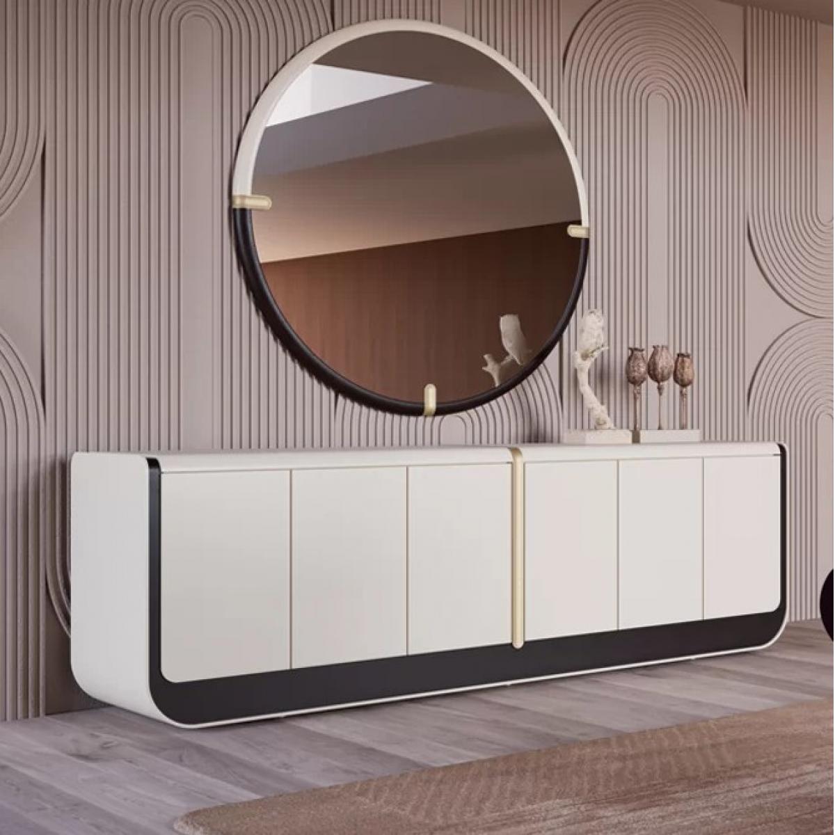 Conçu comme un miroir mural décoratif, il se distingue par ses détails structurels uniques. Trois petites languettes rectangulaires beiges dépassent de l’anneau — deux placées près du haut à gauche et à droite, et une centrée en bas. Ces accents apportent profondeur et rythme architectural, transformant une forme circulaire simple en un objet plus réfléchi. Le résultat est un miroir rond facile à intégrer dans des intérieurs modernes, contemporains ou transitionnels. Associez ce miroir au Buffet élégant de luxe en bois massif crème et beige pour créer un point focal équilibré et sophistiqué qui rehausse la chaleur et l’élégance intemporelle de votre intérieur.