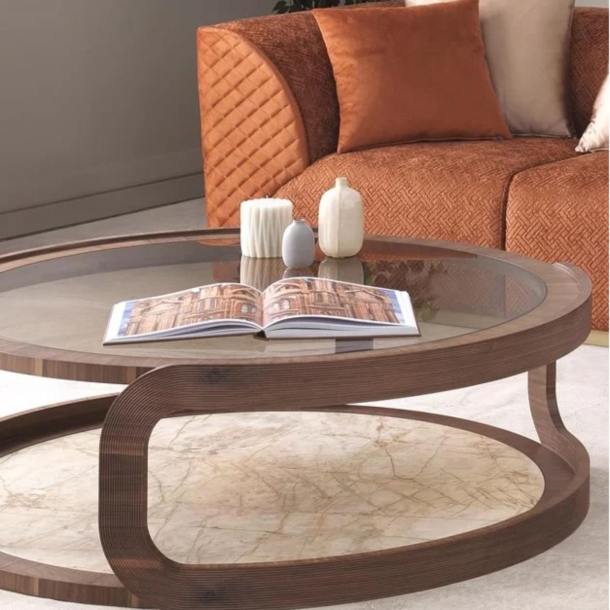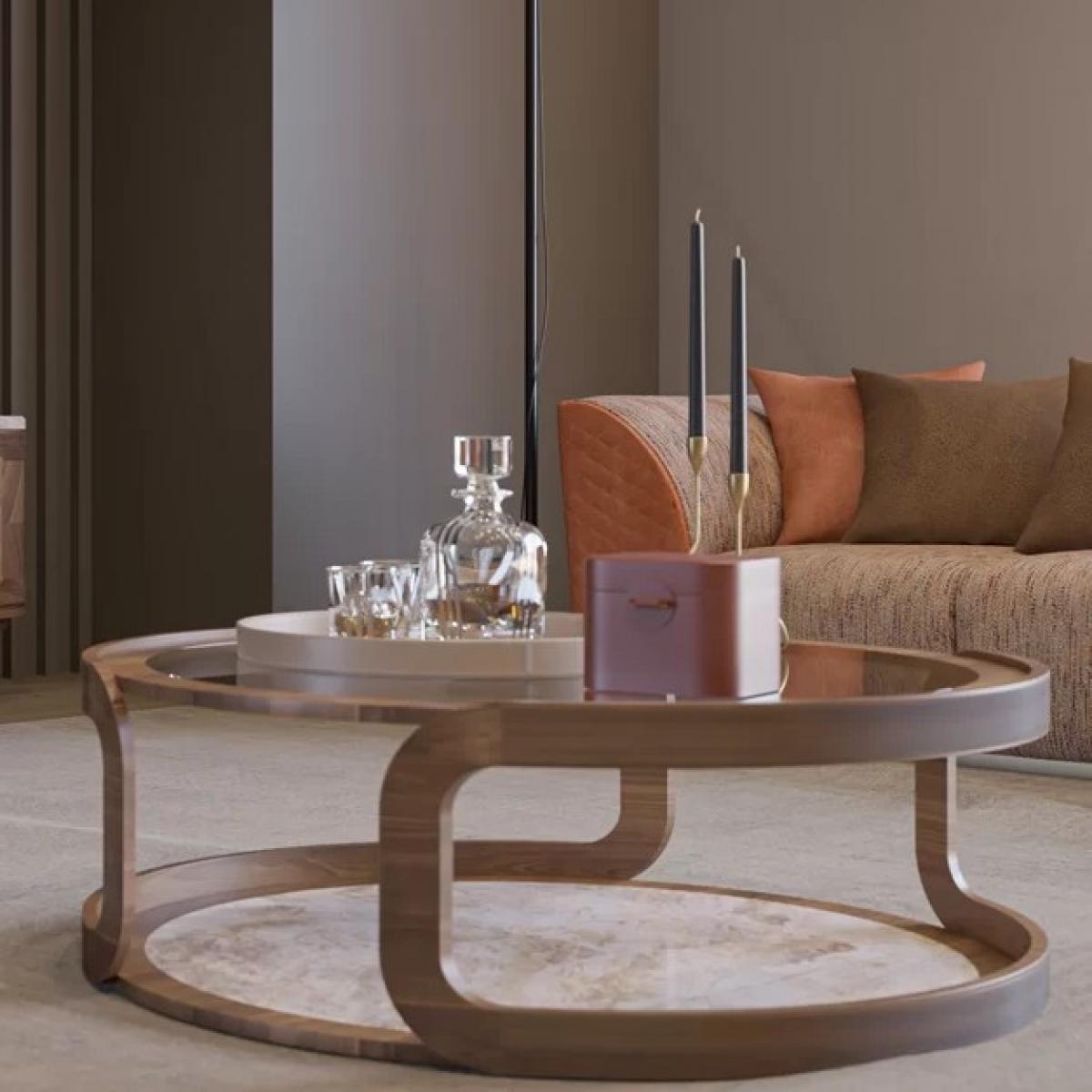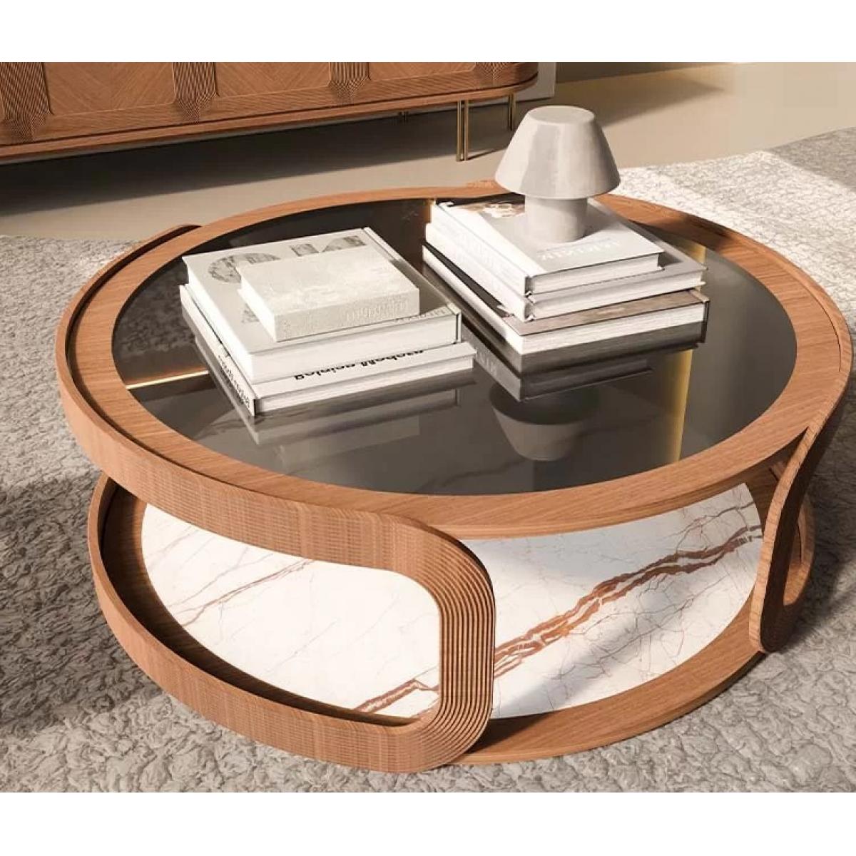 Le design de la table basse avec plateau en verre est complété par une structure unique à double niveau, où la partie inférieure comporte une plaque en marbre beige. Cette plaque en marbre ajoute une touche sophistiquée et renforce la profondeur visuelle de la table. Le design rond de la table basse assure polyvalence et harmonie dans divers styles d'intérieur, du moderne au salon de luxe classique. Sa construction robuste et ses matériaux élégants la rendent adaptée aussi bien aux collections de meubles résidentiels qu'aux meubles d'hôtel haut de gamme.