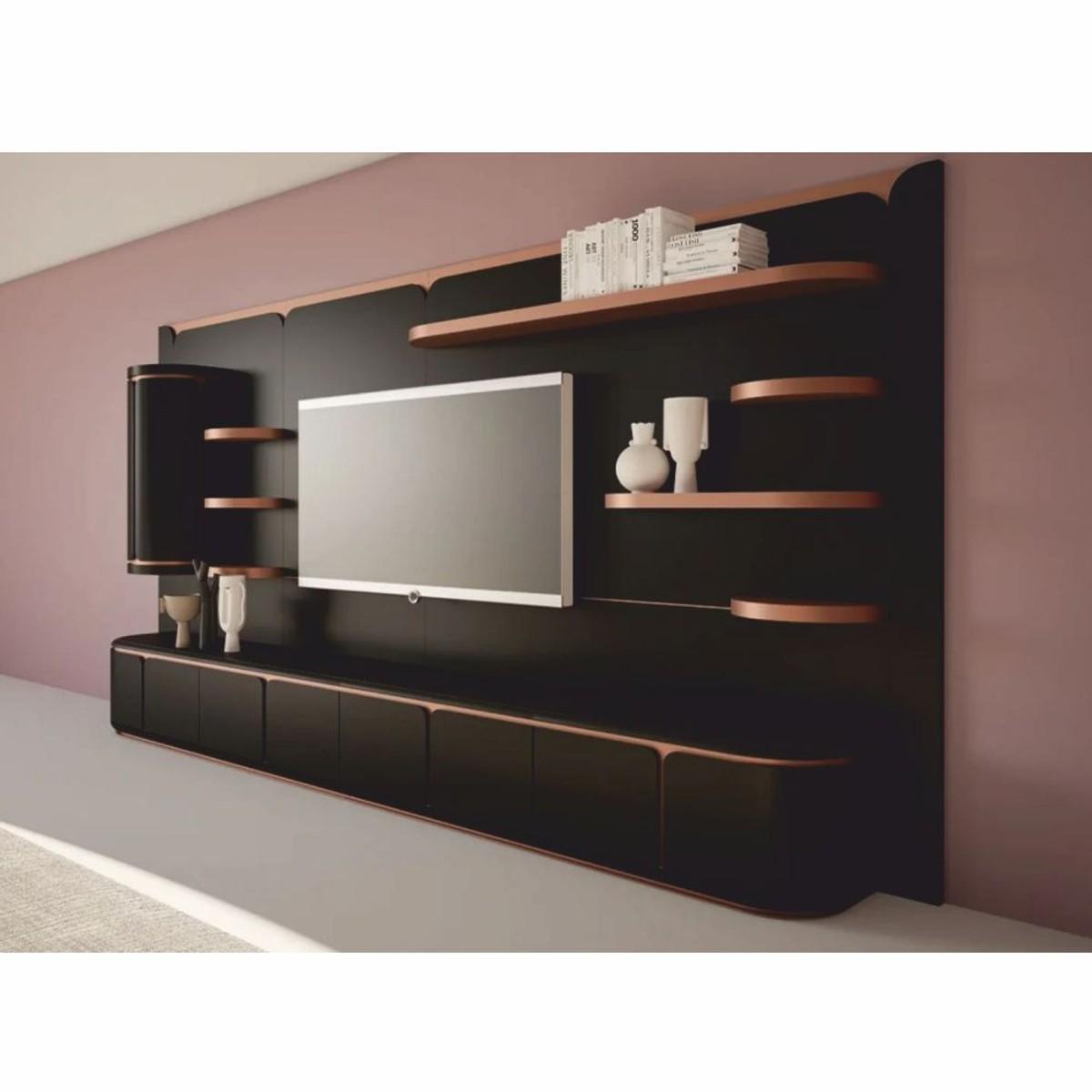 Conçue pour les intérieurs modernes, cette console de divertissement meuble de luxe noir / cuivre allie forme géométrique et contraste de couleurs saisissant. La structure extérieure noire mate encadre une ouverture rectangulaire nette au centre, créant un point focal immédiatement captivant pour votre télévision et votre décoration. Des accents de garniture ton cuivre parcourent les zones supérieures et médianes en lignes horizontales répétées, ajoutant chaleur et rythme visuel à la silhouette carrée et épurée. De fins éléments ton cuivre, semblables à des poignées, se situent le long des sections intérieures, renforçant l’aspect architectural tout en guidant le regard vers le compartiment central.