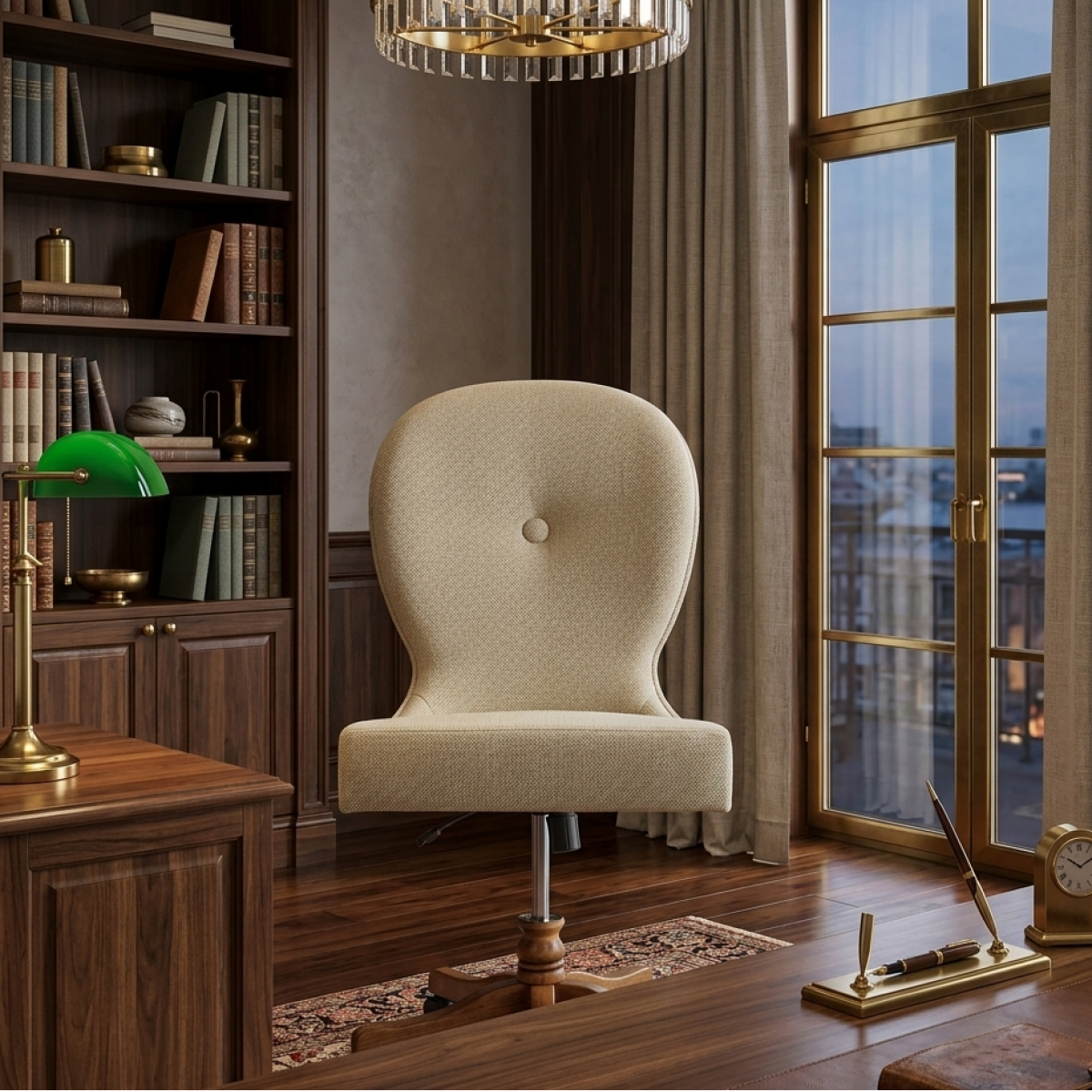 Le Fauteuil de direction rembourré de luxe en tissu beige texturé avec base pivotante en bois réglable reflète un savoir-faire européen raffiné et une élégance exécutive discrète. Ce fauteuil de direction rembourré de luxe présente un dossier doucement incurvé recouvert d’un tissu beige texturé moelleux, offrant à la fois confort ergonomique et sophistication visuelle. La silhouette épurée et les détails minimalistes à boutons créent un look intemporel adapté aux bureaux de direction et aux espaces de travail de luxe. La base pivotante en bois réglable avec roulettes assure une mobilité fluide tout en conservant une esthétique exécutive traditionnelle. Conçu comme un fauteuil de direction design, ce modèle allie fonctionnalité et style élégant.