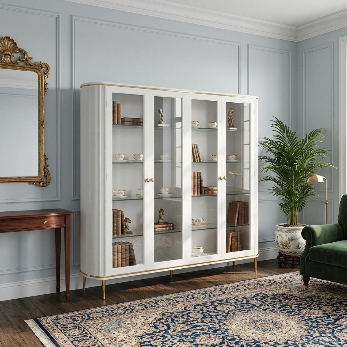 Au-delà de la façade d’exposition, la personnalité du meuble se poursuit dans son profil latéral affirmé. Dotée de panneaux verticaux cannelés distinctifs sur les deux côtés extérieurs, cette vitrine à portes multiples en verre ajoute texture, profondeur et caractère sur mesure à votre décoration. Les pieds fins ton or avec des embouts arrondis raffinés renforcent la silhouette, conservant un look élégant tout en allégeant visuellement la présence d’un meuble imposant. L’harmonie entre le bois peint, le verre clair et les finitions métalliques cohérentes crée une sensation de luxe cohérente qui complète aussi bien les intérieurs classiques que contemporains. En tant que vitrine indépendante, elle est conçue pour se démarquer avec grâce — ajoutant chaleur, structure et une touche mémorable de showroom à votre intérieur. Elle s’accorde parfaitement avec la Vitrine Blanche Baroque à Trois Portes en Verre avec Accents Dorés Peints à la Main, vous permettant de créer un intérieur harmonieux mêlant éléments de luxe contemporains et classiques. Les étagères en verre spacieuses et la configuration à portes multiples font de cette vitrine de luxe un choix idéal pour exposer collections, décorations et accessoires haut de gamme.