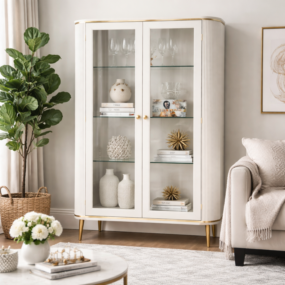 Vitrine de Luxe Blanche à Double Porte en Verre avec Garniture Dorée et Panneau Latéral Cannelé apporte un glamour moderne à l'organisation quotidienne avec une silhouette confiante et stylée. Cette vitrine de luxe est conçue pour sublimer ce que vous choisissez de ranger et d'exposer, associant une finition blanche épurée à des accents dorés brillants qui captent magnifiquement la lumière. Les panneaux latéraux cannelés ajoutent une dimension tactile, donnant à la pièce un aspect plus travaillé que le mobilier de rangement classique, tandis que l'apparence lisse et mate du cadre maintient un look lumineux et contemporain. Qu'elle soit placée dans un salon, une salle à manger ou une entrée, la présence raffinée de la vitrine contribue à un intérieur volontairement stylé, sans encombrement.