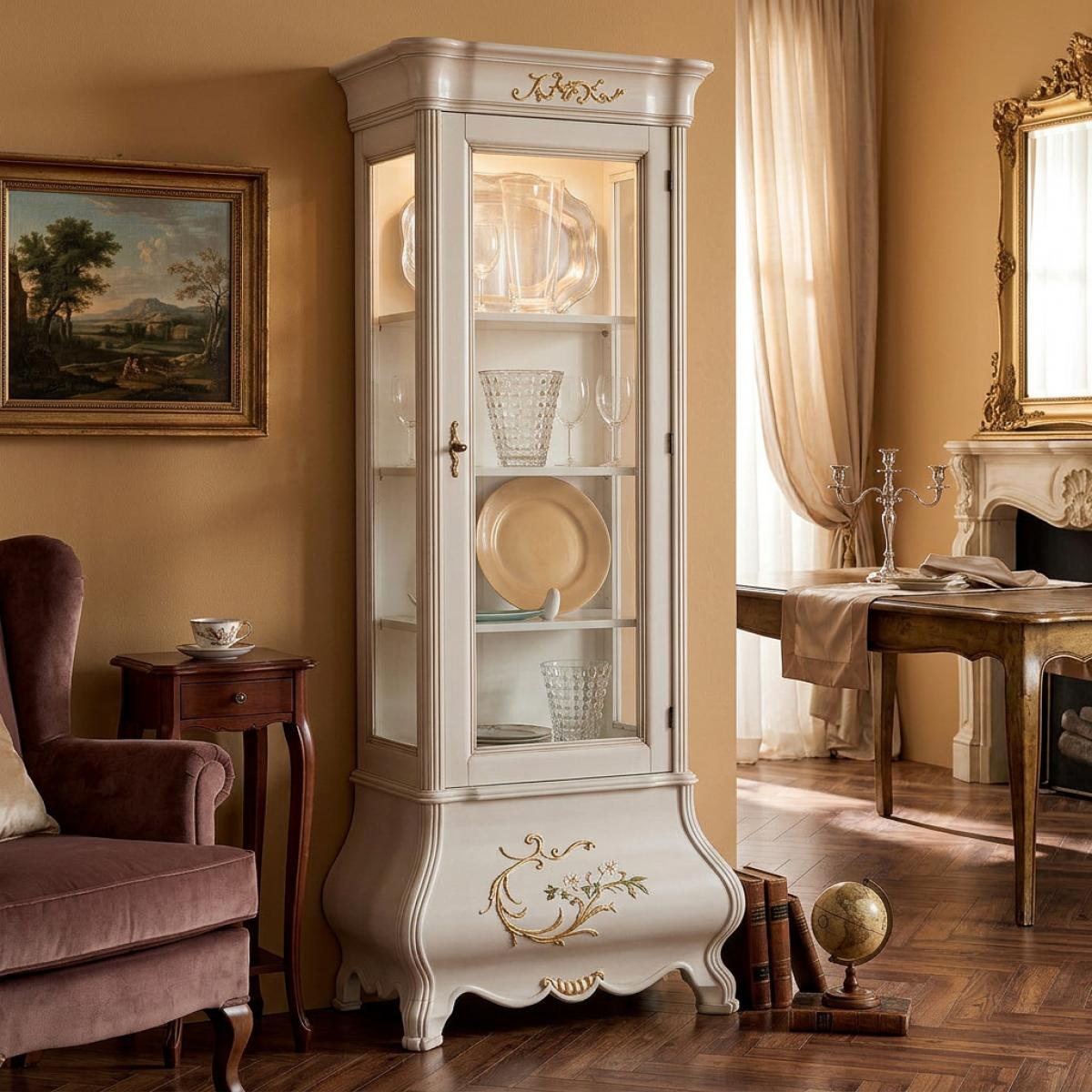 Vitrine Baroque de Luxe Blanche Laquée à Porte Unique en Verre avec Accents Dorés Peints à la Main incarne l'élégance européenne raffinée et un savoir-faire intemporel. Cette vitrine de luxe présente une finition en bois laqué premium, des panneaux en verre et des détails dorés délicatement peints à la main qui soulignent sa silhouette sophistiquée. La base courbée gracieuse, la moulure de couronne décorative et les proportions élégantes créent une présence distinguée, faisant de cette vitrine baroque un choix parfait pour les salons luxueux, les salles à manger ou les intérieurs raffinés.