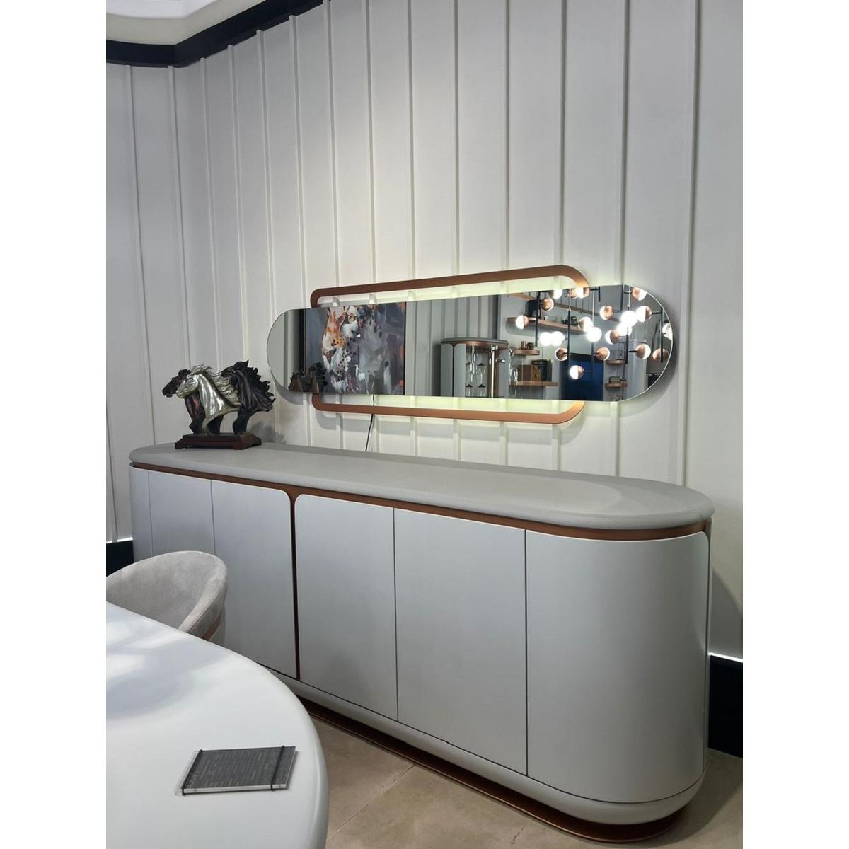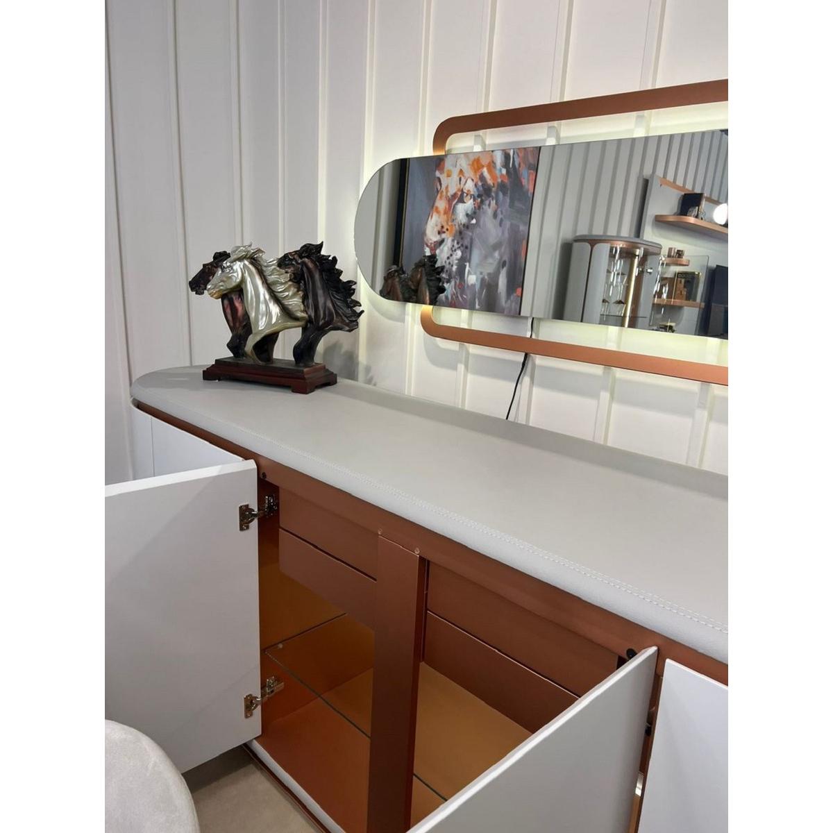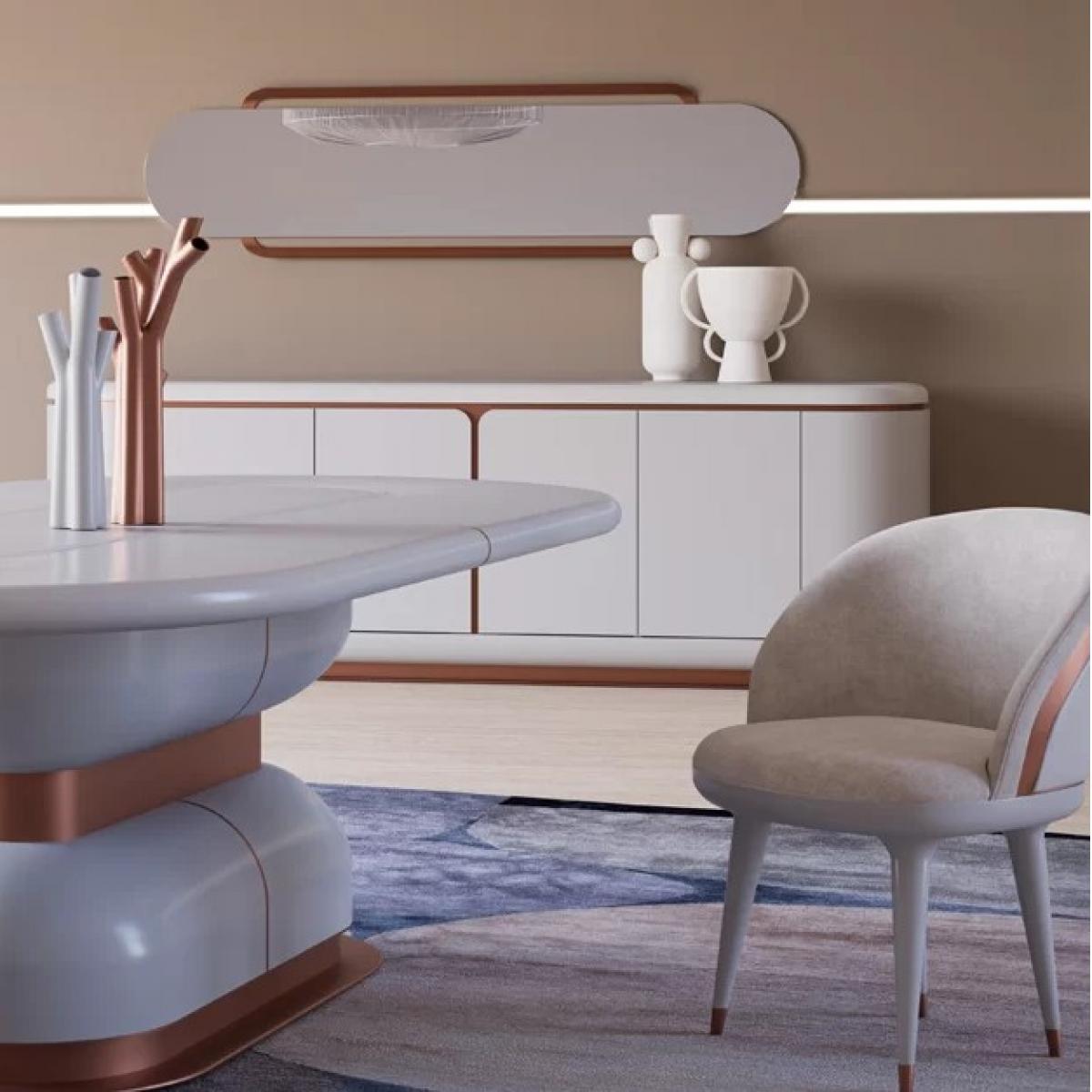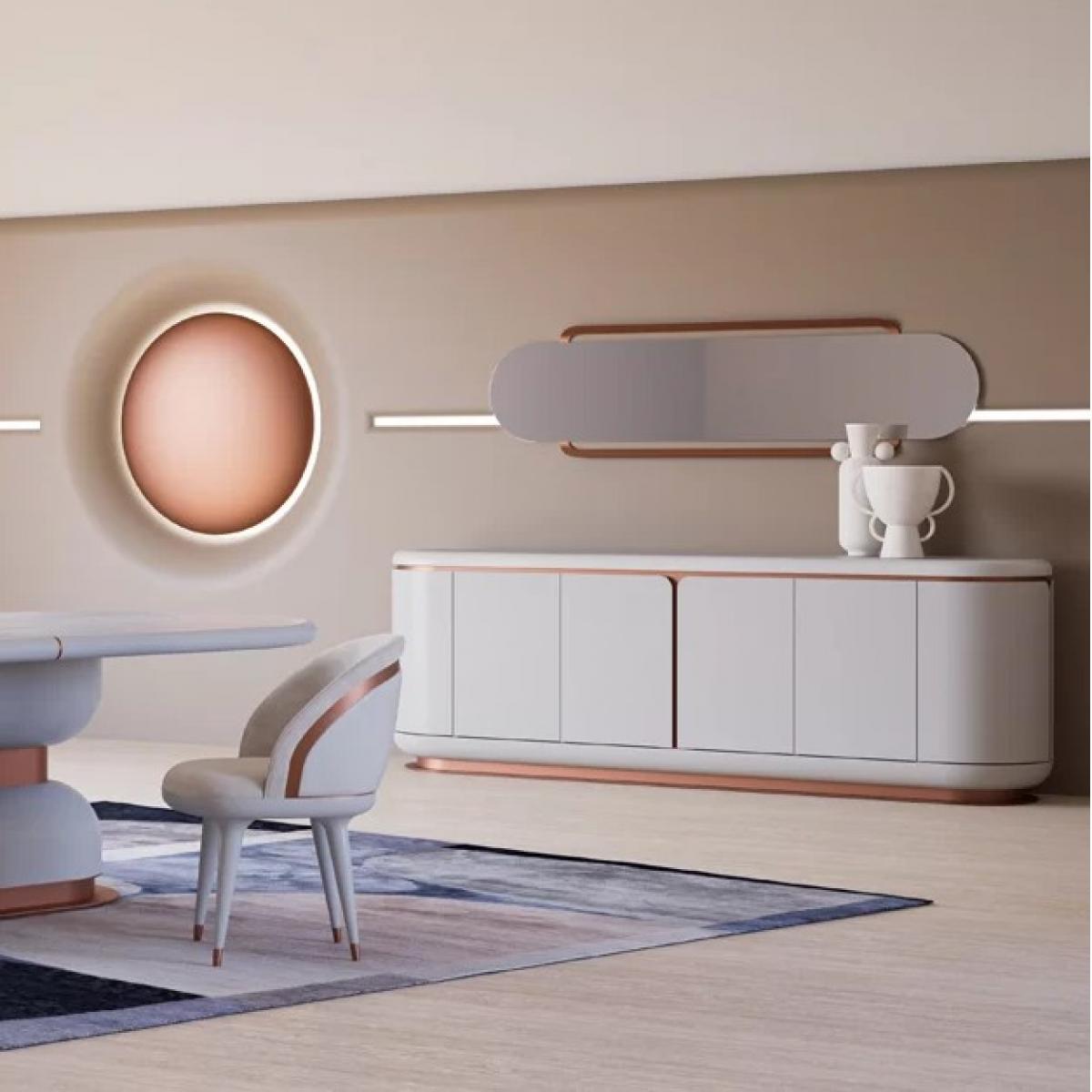 Intégrez ce buffet de luxe en bois massif blanc/cuivre avec 4 portes à votre collection de meubles de salle à manger de luxe pour créer un environnement cohérent et élégant. Cette pièce sert non seulement d’unité de rangement fonctionnelle mais aussi d’expression de goût raffiné. Explorez notre collection de buffets de luxe pour trouver des pièces assorties qui valorisent l’esthétique de votre intérieur. Avec sa combinaison de design élégant et de fonctionnalités pratiques, ce buffet est parfait pour ceux qui apprécient à la fois la beauté et l’utilité dans leur mobilier. Associez-le à la table à manger de luxe ovale avec plateau en marbre blanc et accents cuivre pour créer un espace repas cohérent et sophistiqué.