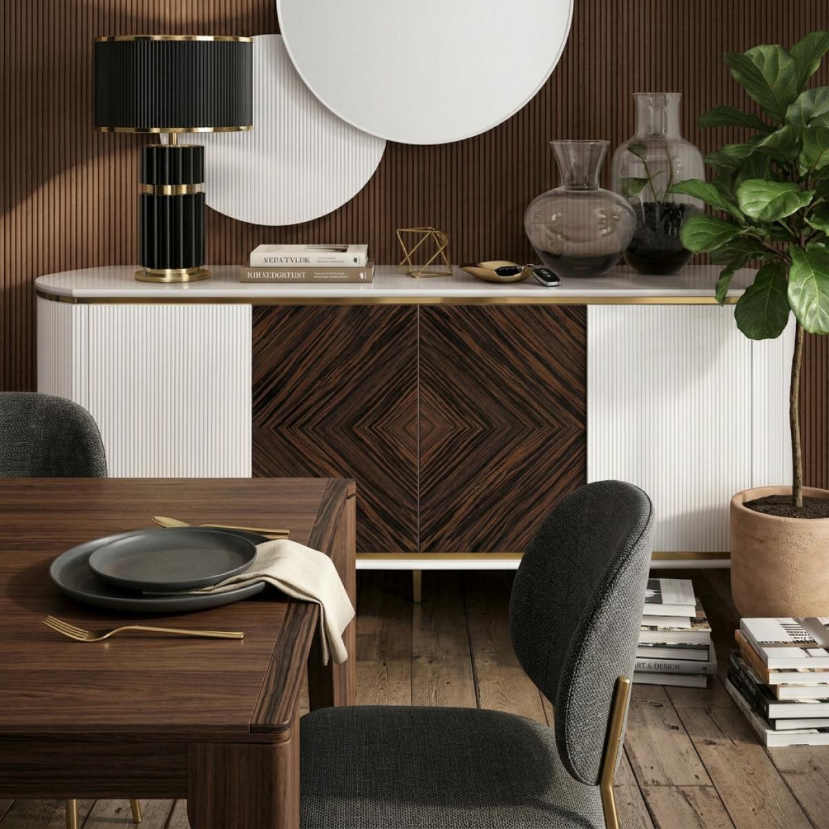 Buffet blanc de luxe avec accents dorés, panneaux blancs cannelés et portes en placage bois foncé est un buffet de luxe raffiné conçu pour des intérieurs contemporains sophistiqués. Doté d’une finition blanche épurée, ce buffet design présente des panneaux texturés cannelés combinés à des portes en placage bois foncé disposées selon un motif géométrique. Les subtils accents dorés le long des bords et des pieds fins renforcent l’esthétique moderne, tandis que le grand espace de rangement dans le meuble assure la fonctionnalité. Conçu avec équilibre et élégance, ce meuble offre à la fois un attrait décoratif et un rangement pratique, idéal pour les salons, les salles à manger ou les entrées élégantes.
