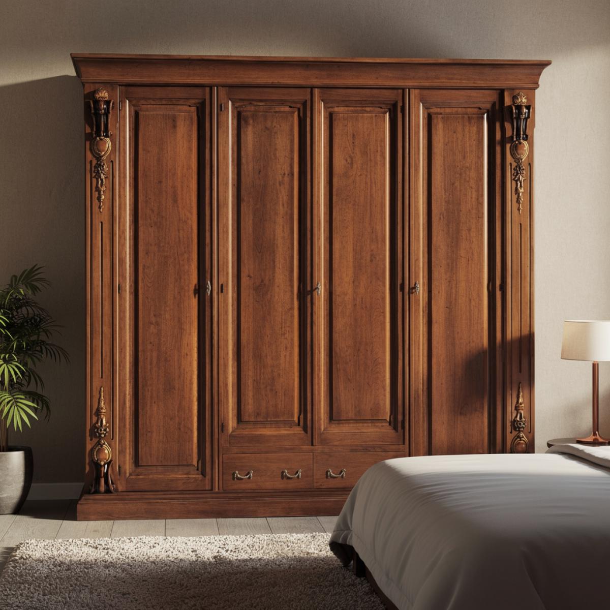Apportez un sens organisé et stylé à votre routine quotidienne avec cette armoire étagère en bois pour salon. Les tons chauds et les accents dorés en laiton créent un contraste accueillant qui s'associe naturellement aux finitions en bois riches, aux textiles traditionnels et à une décoration soigneusement choisie. Utilisez l'armoire pour organiser le linge, ranger les essentiels du quotidien hors de vue ou exposer des accents sélectionnés pour qu'ils paraissent intentionnels plutôt que dispersés. La combinaison de portes à panneaux et d'une base à tiroirs ajoute de la polyvalence pour les petits objets nécessitant un accès rapide, tandis que la quincaillerie ornementale offre un look cohérent et raffiné. Placée dans un salon, un dressing ou un couloir, l'armoire soutient à la fois la fonction et l'atmosphère — offrant le charme prêt à exposer de l'artisanat inspiré du baroque aux côtés d'un rangement qui maintient votre intérieur élégamment stylé sans effort. Ceux qui sont attirés par le même caractère riche du noyer et les détails sculptés des pilastres avec le drame supplémentaire d'un panneau miroir central pleine hauteur peuvent souhaiter explorer la Armoire Baroque en Bois à Portes Coulissantes avec Panneau Miroir Central — une pièce compagnon d'égale grandeur qui introduit un mécanisme de porte coulissante et un panneau central réfléchissant pour les intérieurs qui privilégient la luminosité et l'amplification spatiale aux côtés de leur ornementation classique.