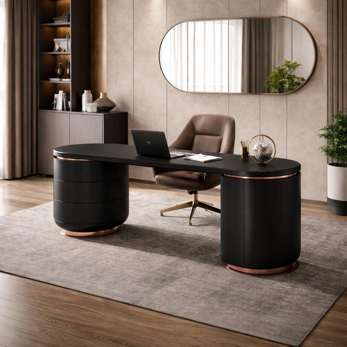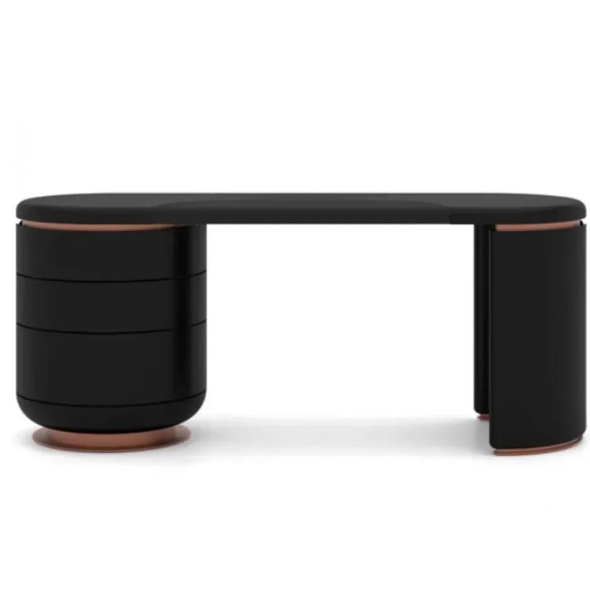 Au-delà de son apparence saisissante, l'agencement met l'accent sur une organisation fonctionnelle. Le rangement tiroir offre un espace pour garder les objets du quotidien à portée de main tout en maintenant une surface propre et une ambiance visuelle apaisante. Les tons chauds des accents se retrouvent le long des bords et sous la surface, renforçant la profondeur et le savoir-faire. Si vous recherchez un bureau avec plateau noir qui propose également des solutions de rangement discrètes ou intégrées, ce modèle répond parfaitement à ce besoin tout en conservant une apparence extérieure épurée. Associez ce bureau au buffet en bois massif finition noire et cuivre pour créer un espace de travail harmonieux alliant élégance, rangement et sophistication raffinée.